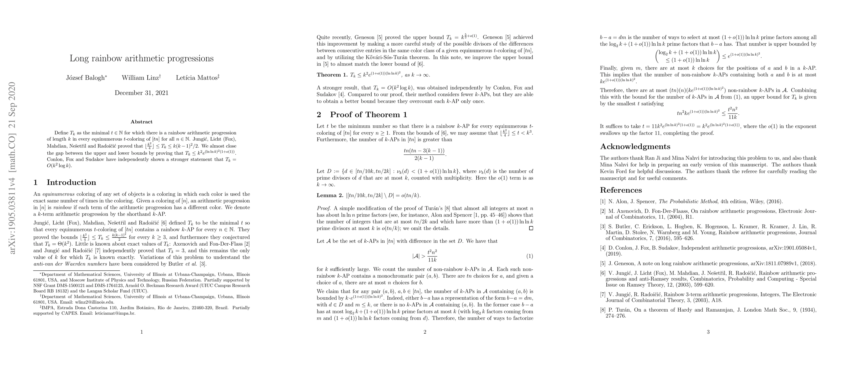 This paper establishes an upper bound for $T_k$, the smallest $t$ ensuring a rainbow arithmetic progression of length $k$ in every equinumerous $t$-coloring of $[tn]$ for all $n$. The authors prove that $T_k \le k^2e^{(\ln\ln k)^2(1+o(1))}$, nearly closing the gap with the previously known lower bound $\lfloor{\frac{k^2}{4}\rfloor}$.