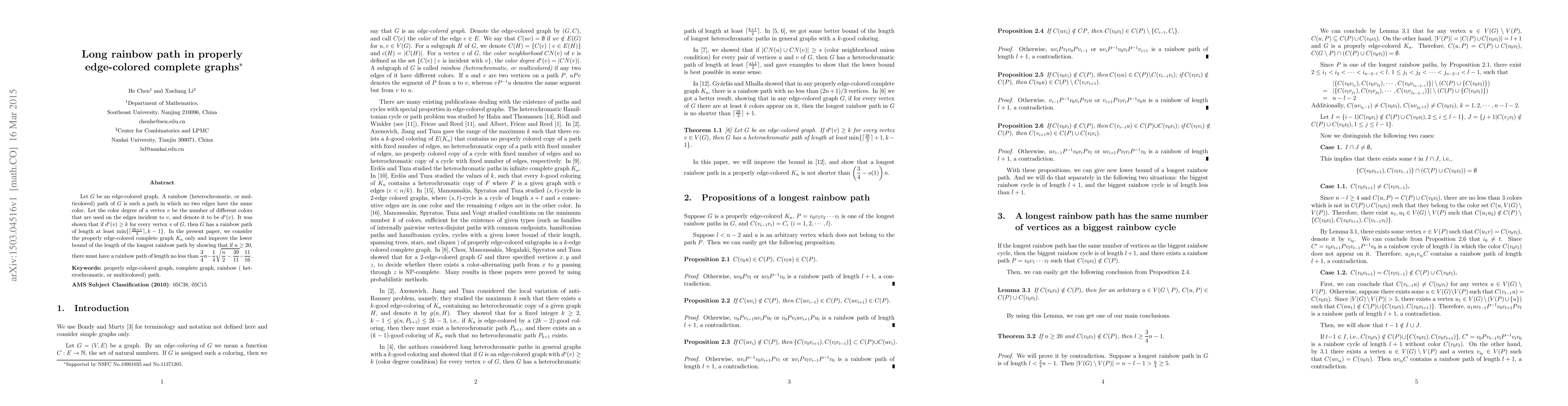 Let $G$ be an edge-colored graph. A rainbow (heterochromatic, or multicolored) path of $G$ is such a path in which no two edges have the same color. Let the color degree of a vertex $v$ be the number of different colors that are used on the edges incident to $v$, and denote it to be $d^c(v)$. It was shown that if $d^c(v)\geq k$ for every vertex $v$ of $G$, then $G$ has a rainbow path of length at least $\min\{\lceil\frac{2k+1}{3}\rceil,k-1\}$. In the present paper, we consider the properly edge-colored complete graph $K_n$ only and improve the lower bound of the length of the longest rainbow path by showing that if $n\geq 20$, there must have a rainbow path of length no less than $\displaystyle \frac{3}{4}n-\frac{1}{4}\sqrt{\frac{n}{2}-\frac{39}{11}}-\frac{11}{16}$.