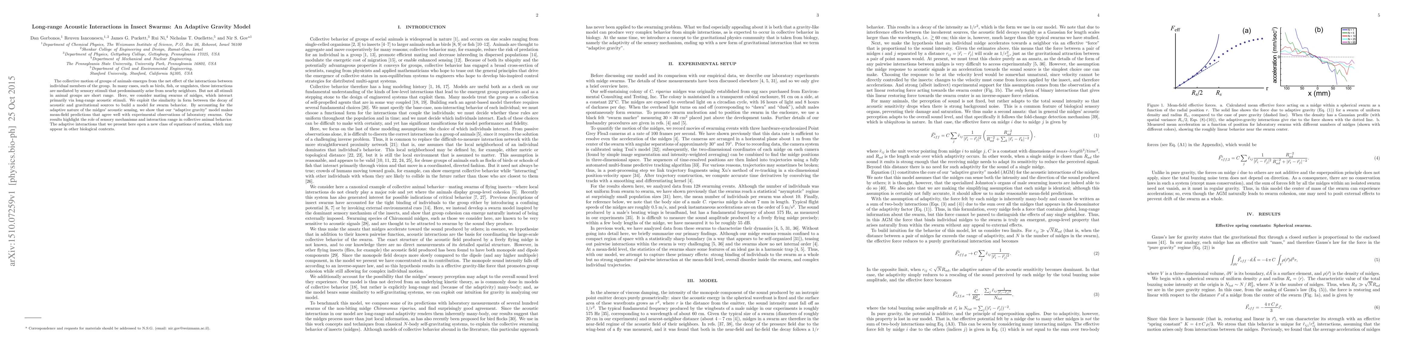 This paper develops an "adaptive gravity" model to describe the long-range acoustic interactions in midge swarms, showing good agreement with experimental observations. The model highlights the importance of sensory mechanisms and interaction range in collective animal behavior.