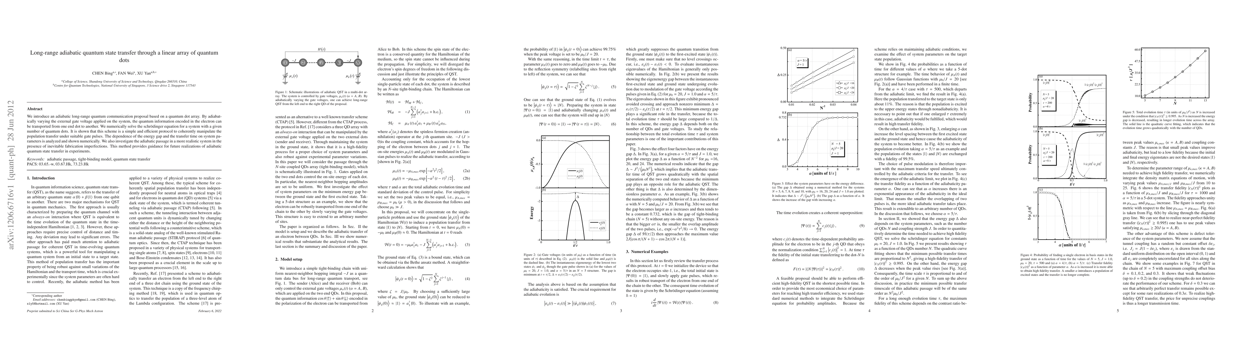 This paper proposes a method for long-range adiabatic quantum state transfer through a linear array of quantum dots by varying external gate voltages. Numerical simulations demonstrate the efficiency of this protocol in coherently transferring quantum information, while also analyzing the effects of imperfections and system parameters on the process.