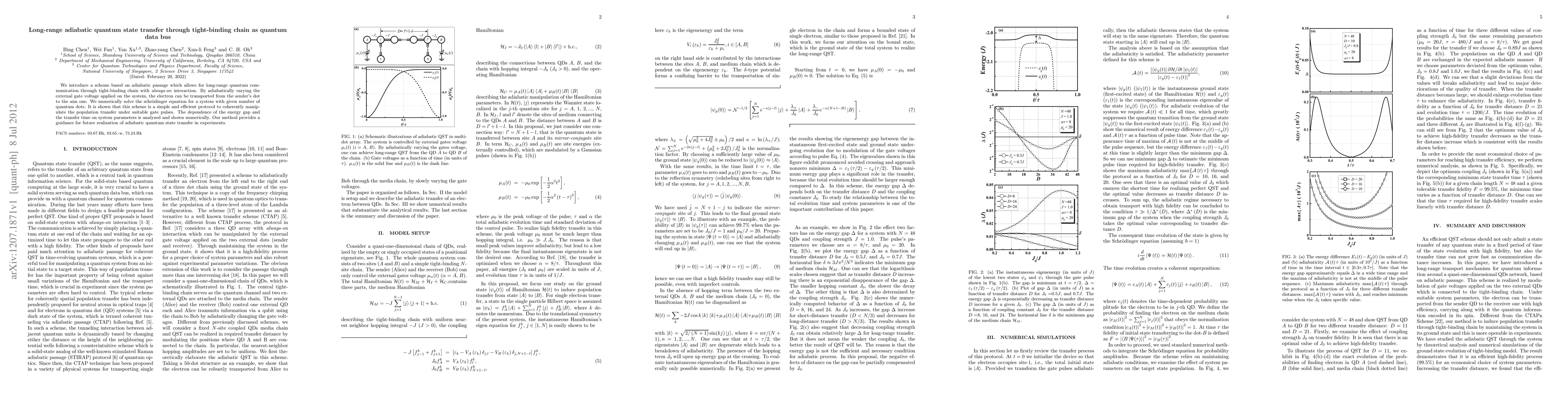This paper proposes an adiabatic passage scheme for long-range quantum communication via a tight-binding chain, where electron transport is achieved by varying external gate voltages. Numerical simulations demonstrate the efficiency of this protocol for coherent population transfer, and the study analyzes the impact of energy gap and transfer time on system parameters.