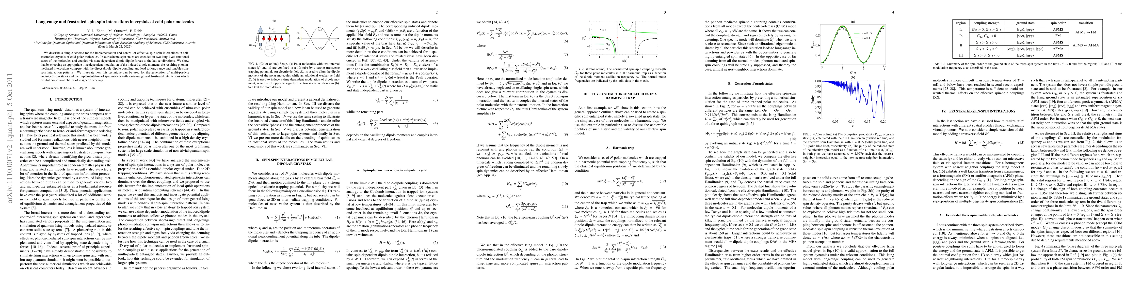 This paper proposes a method for controlling spin-spin interactions in cold polar molecule crystals by encoding spin states in rotational states and coupling them via lattice vibrations. The modulation of dipole moments enables tunable, long-range interactions and facilitates the generation of entangled spin states and complex magnetic ordering phases.