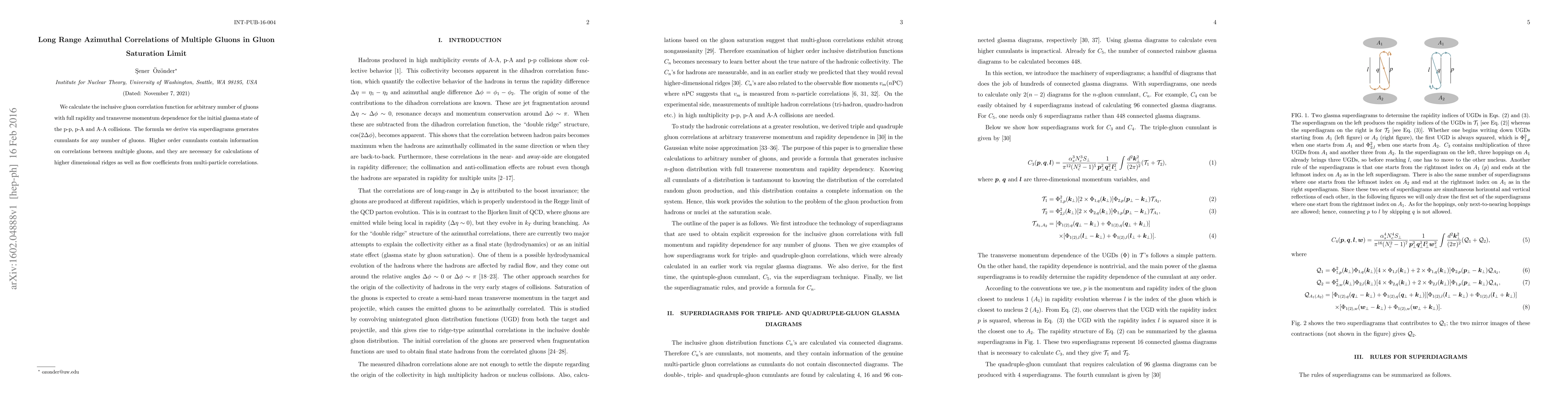 We calculate the inclusive gluon correlation function for arbitrary number of gluons with full rapidity and transverse momentum dependence for the initial glasma state of the p-p, p-A and A-A collisions. The formula we derive via superdiagrams generates cumulants for any number of gluons. Higher order cumulants contain information on correlations between multiple gluons, and they are necessary for calculations of higher dimensional ridges as well as flow coefficients from multi-particle correlations.