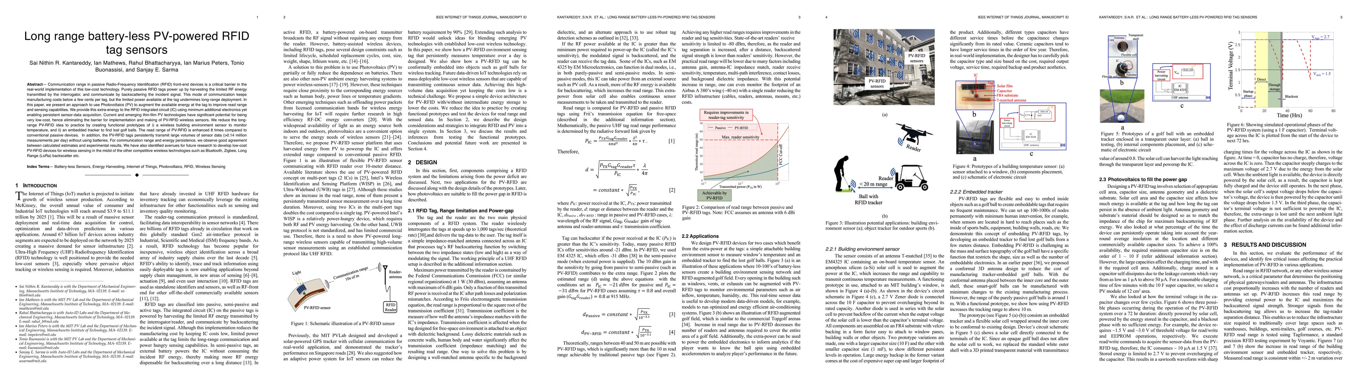 This paper proposes a photovoltaic (PV) augmentation method to enhance the long-range communication and persistent data acquisition of passive RFID tags, achieving an 8-fold increase in read range compared to conventional passive tags. The approach uses low-cost thin-film PV technology to power RFID sensors without batteries, demonstrated through prototypes for environmental monitoring and golf ball tracking.