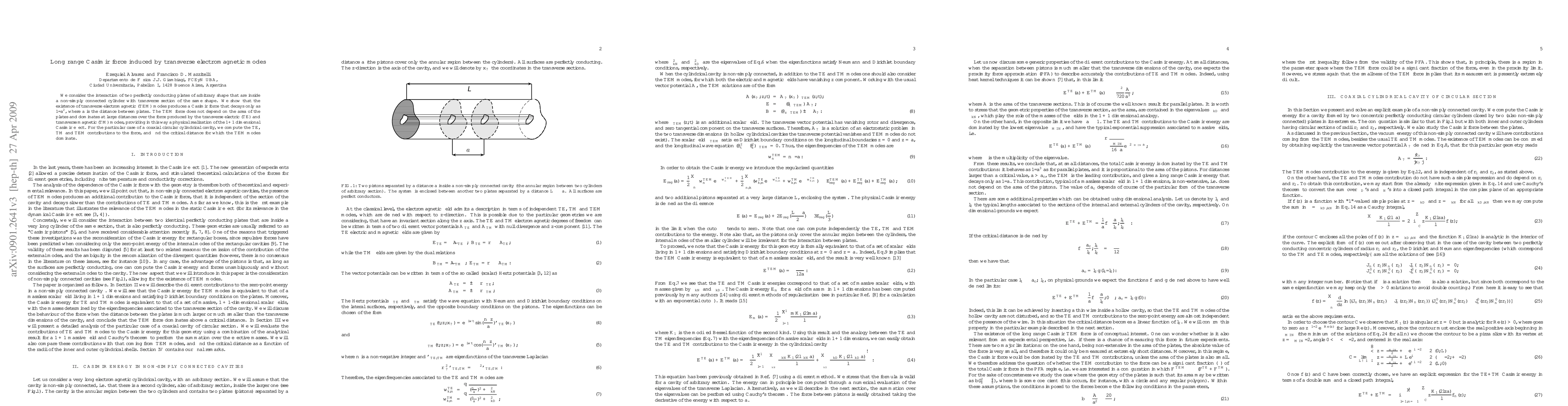This paper investigates the Casimir force between two conducting plates within a non-simply connected cylindrical cavity, demonstrating that transverse electromagnetic modes induce a long-range force decaying as $1/a^2$, dominating over other modes at large distances and realizing a 1+1 dimensional Casimir effect. For coaxial cylindrical cavities, the study computes the contributions of TE, TM, and TEM modes and identifies the critical distance for TEM dominance.