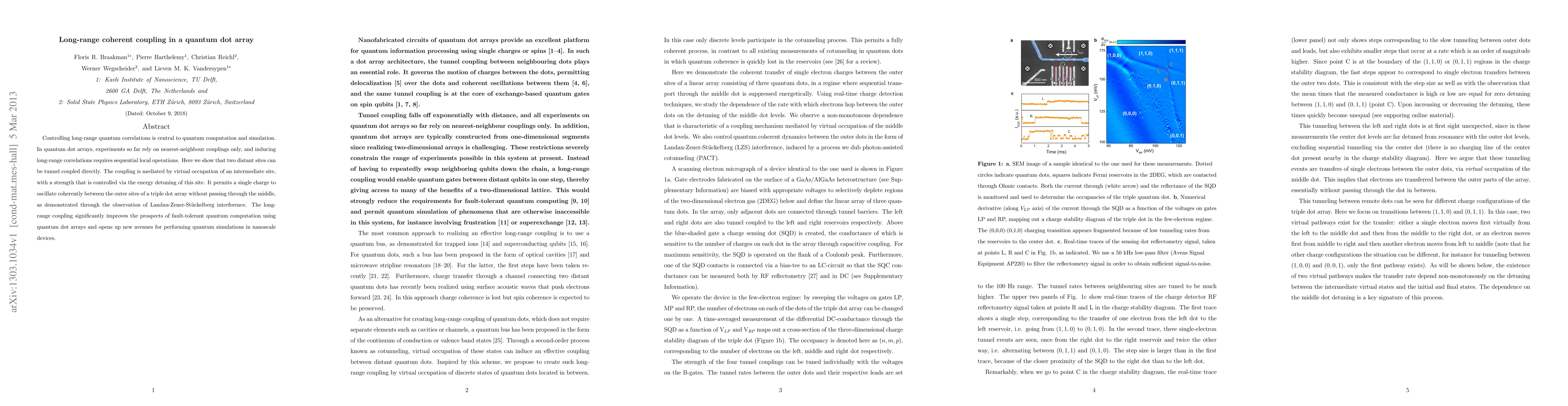Controlling long-range quantum correlations is central to quantum computation and simulation. In quantum dot arrays, experiments so far rely on nearest-neighbour couplings only, and inducing long-range correlations requires sequential local operations. Here we show that two distant sites can be tunnel coupled directly. The coupling is mediated by virtual occupation of an intermediate site, with a strength that is controlled via the energy detuning of this site. It permits a single charge to oscillate coherently between the outer sites of a triple dot array without passing through the middle, as demonstrated through the observation of Landau-Zener-St\"uckelberg interference. The long-range coupling significantly improves the prospects of fault-tolerant quantum computation using quantum dot arrays and opens up new avenues for performing quantum simulations in nanoscale devices.