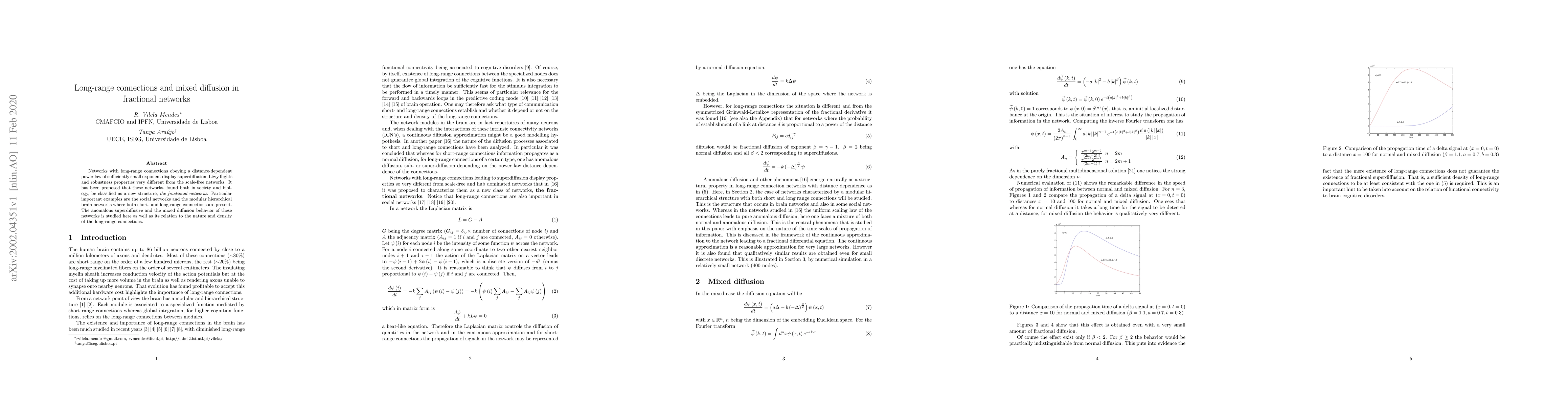 Networks with long-range connections obeying a distance-dependent power law of sufficiently small exponent display superdiffusion, L\'evy flights and robustness properties very different from the scale-free networks. It has been proposed that these networks, found both in society and biology, be classified as a new structure, the fractional networks. Particular important examples are the social networks and the modular hierarchical brain networks where both short- and long-range connections are present. The anomalous superdiffusive and the mixed diffusion behavior of these networks is studied here as well as its relation to the nature and density of the long-range connections.