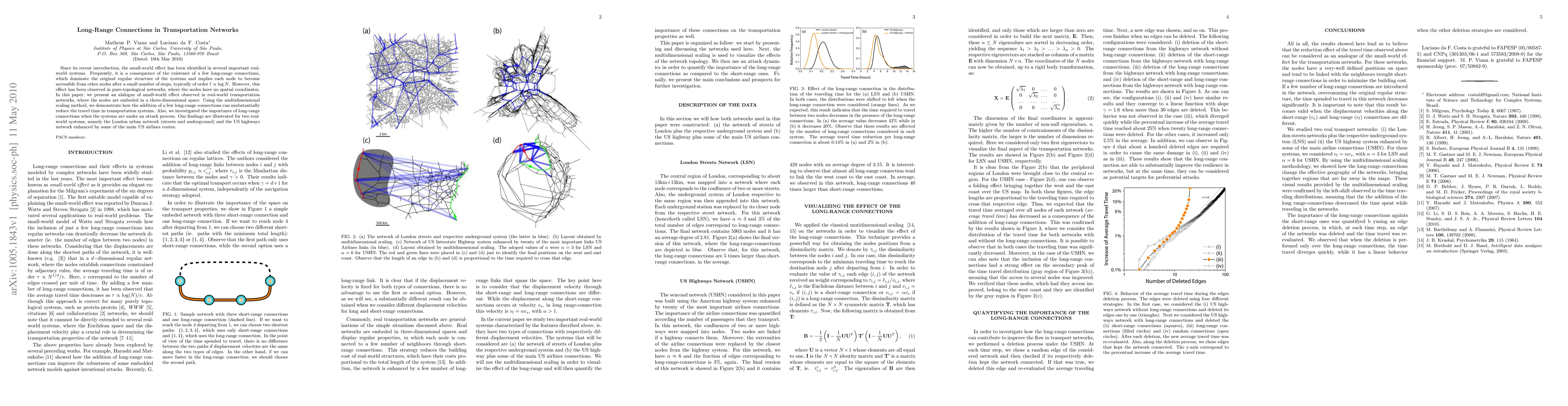 Researchers demonstrate how adding a few long-range connections to transportation networks can substantially reduce travel time using multidimensional scaling method. The study also explores the impact of long-range connections on network resilience under attack scenarios.