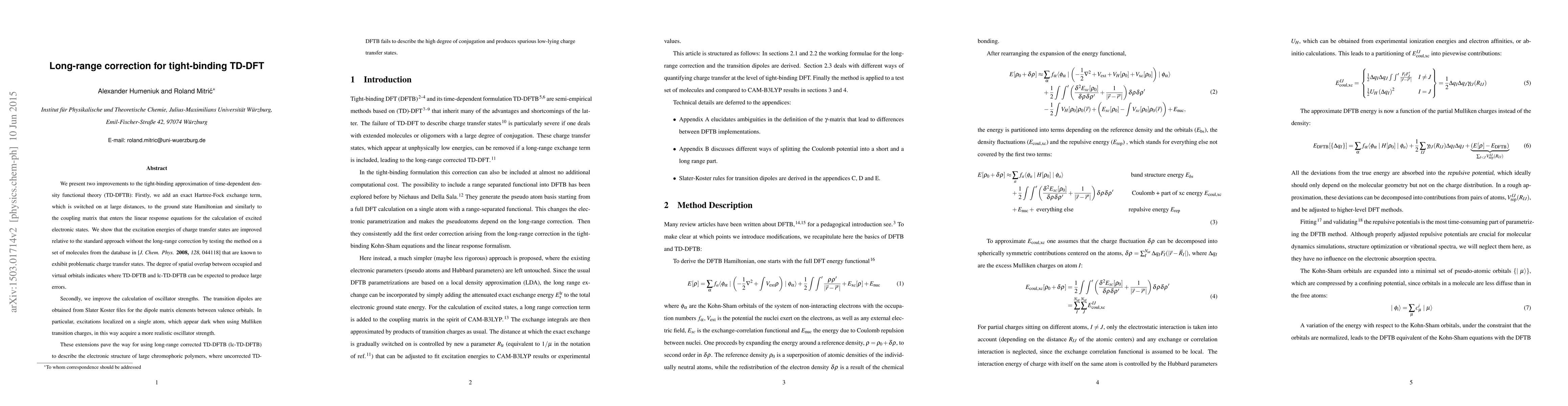 This paper introduces two enhancements to the tight-binding approximation of time-dependent density functional theory (TD-DFTB): an exact long-range Hartree-Fock exchange term and improved oscillator strength calculations. These corrections improve the description of charge transfer states and localized excitations, enabling more accurate modeling of large chromophoric polymers.