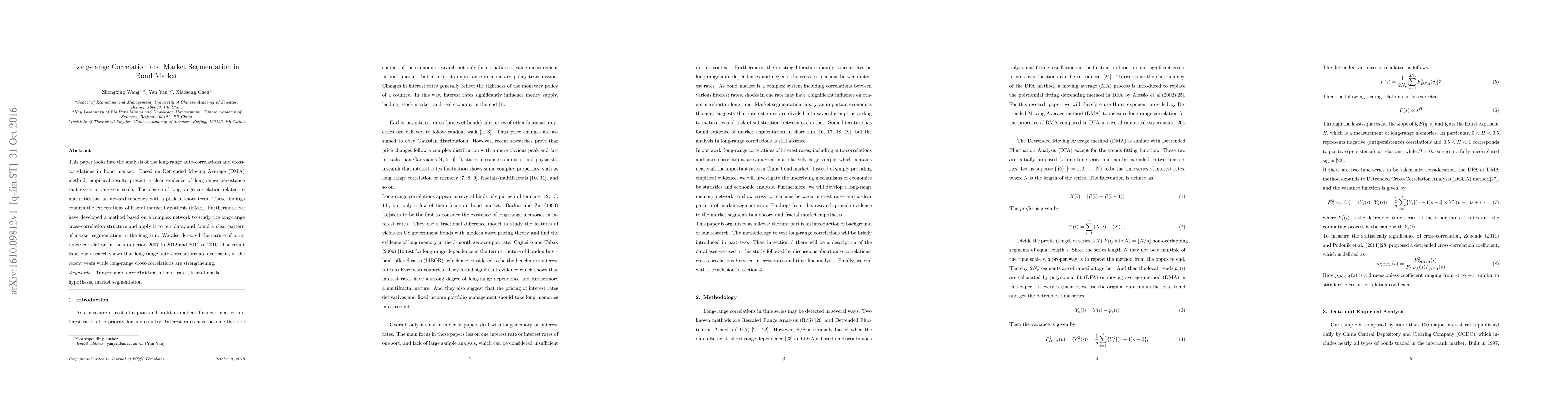 This paper looks into the analysis of the long-range auto-correlations and cross-correlations in bond market. Based on Detrended Moving Average (DMA) method, empirical results present a clear evidence of long-range persistence that exists in one year scale. The degree of long-range correlation related to maturities has an upward tendency with a peak in short term. These findings confirm the expectations of fractal market hypothesis (FMH). Furthermore, we have developed a method based on a complex network to study the long-range cross-correlation structure and apply it to our data, and found a clear pattern of market segmentation in the long run. We also detected the nature of long-range correlation in the sub-period 2007 to 2012 and 2011 to 2016. The result from our research shows that long-range auto-correlations are decreasing in the recent years while long-range cross-correlations are strengthening.