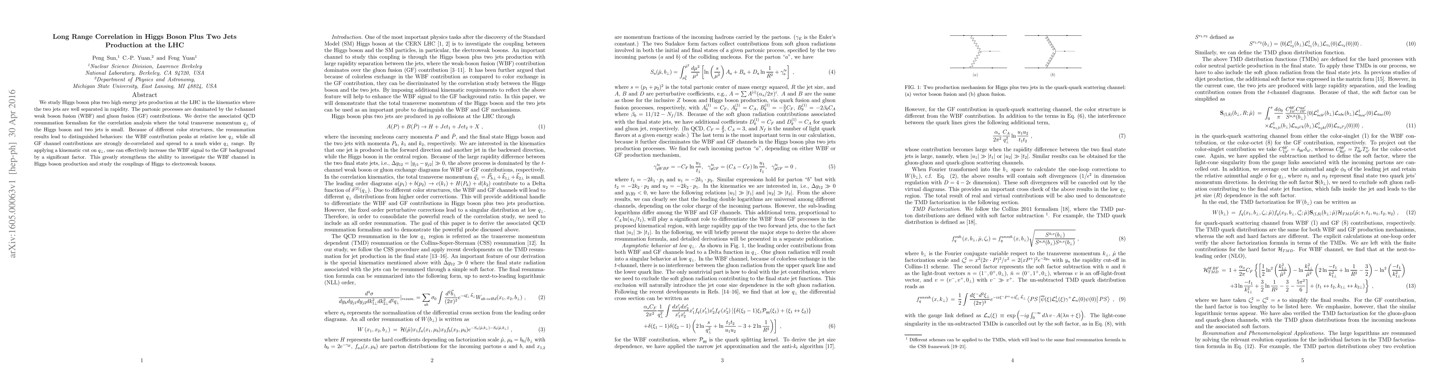 This paper investigates Higgs boson production accompanied by two high-energy jets at the LHC, focusing on the kinematic separation of jets. It develops a QCD resummation formalism to analyze long-range correlations, revealing that the weak boson fusion channel peaks at lower transverse momentum, while gluon fusion contributions are more spread out, thus enhancing the WBF signal relative to the GF background.