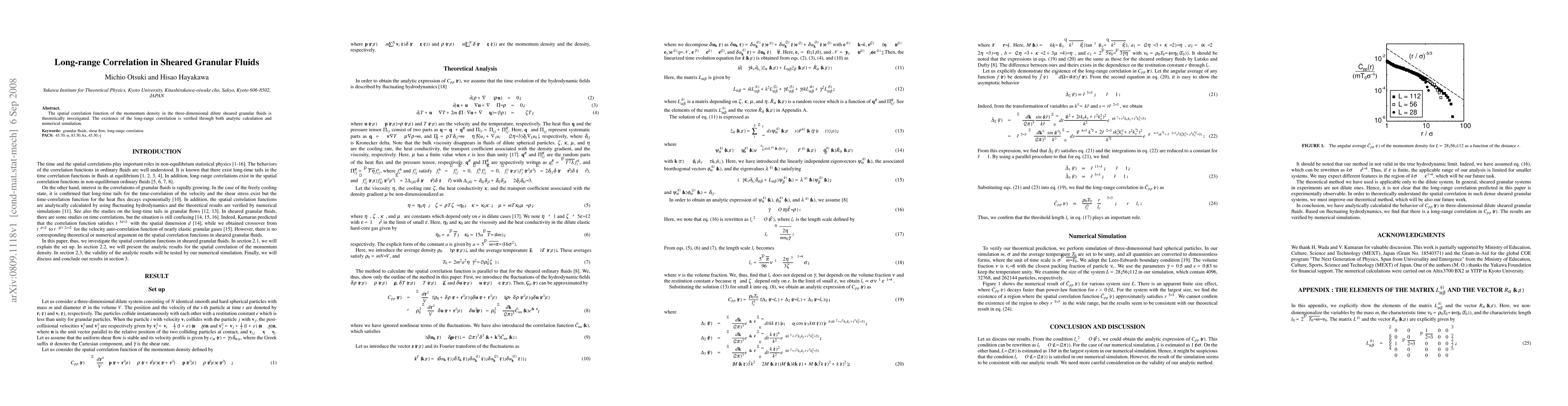 This paper investigates the spatial correlation function of momentum density in three-dimensional sheared granular fluids, confirming the presence of long-range correlations via both theoretical analysis and numerical simulations.