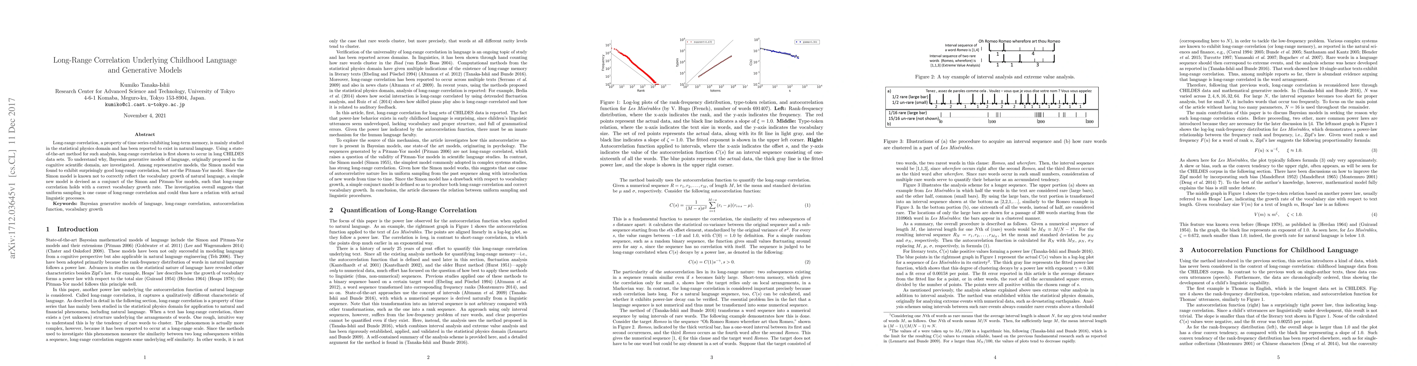 This paper investigates long-range correlation in childhood language data and finds that it aligns with the properties of Bayesian generative models. The Simon model, despite not accurately reflecting vocabulary growth, shows good long-range correlation, leading to the development of a new model that combines the Simon and Pitman-Yor models to achieve both long-range correlation and correct vocabulary growth.