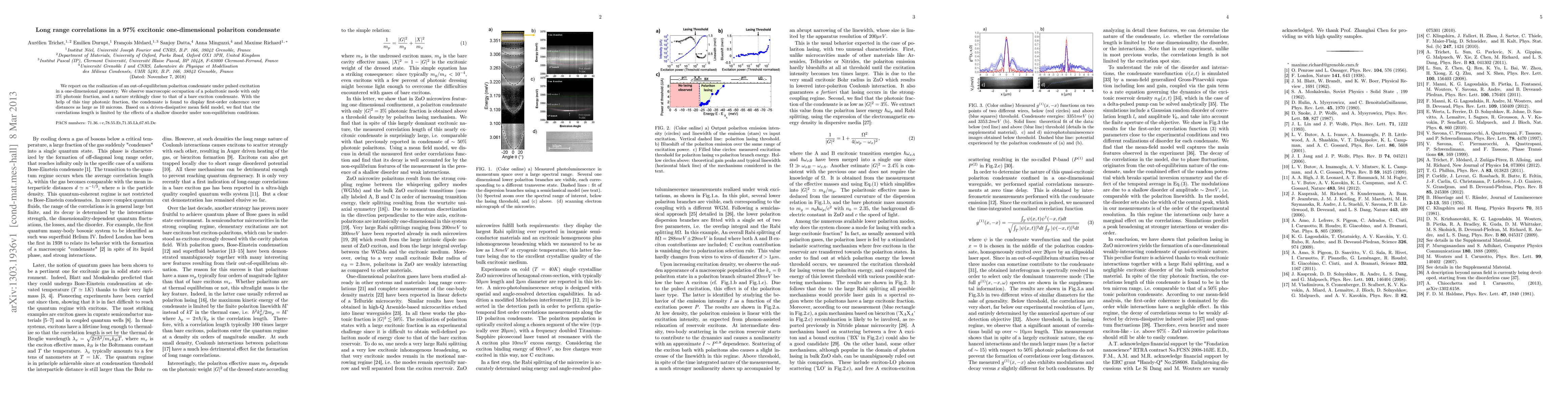 This paper reports on the creation of a one-dimensional polariton condensate with minimal photonic content, exhibiting first-order coherence over 10 microns. The study reveals long-range correlations limited by shallow disorder in the non-equilibrium system, modeled through a driven-dissipative mean field approach.
