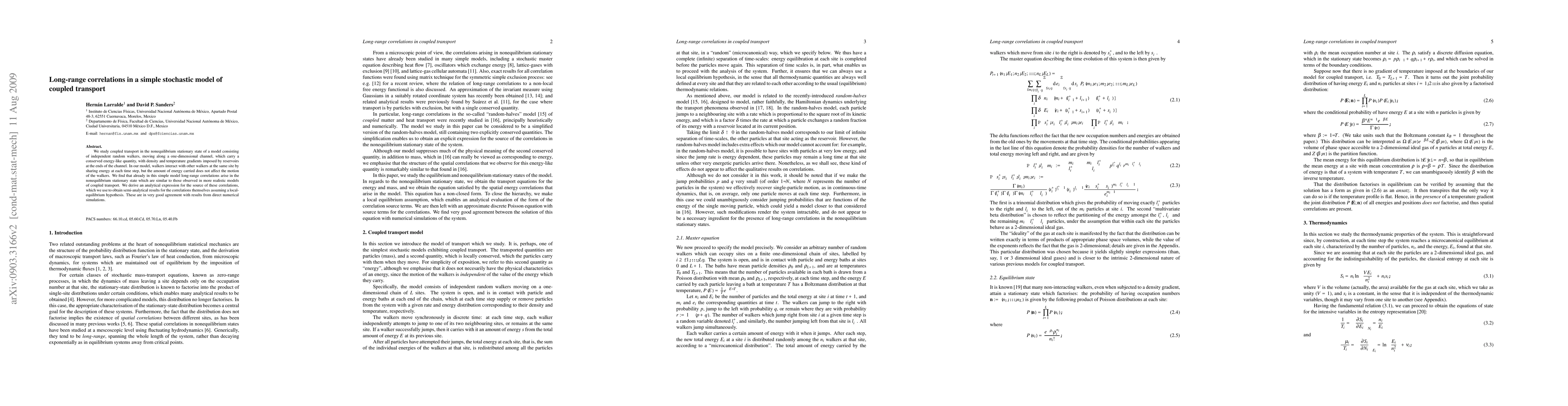 This paper investigates a stochastic model of coupled transport where random walkers share energy at shared sites but are unaffected by the energy carried. The study reveals long-range correlations in the nonequilibrium stationary state, akin to those seen in more complex coupled transport models.