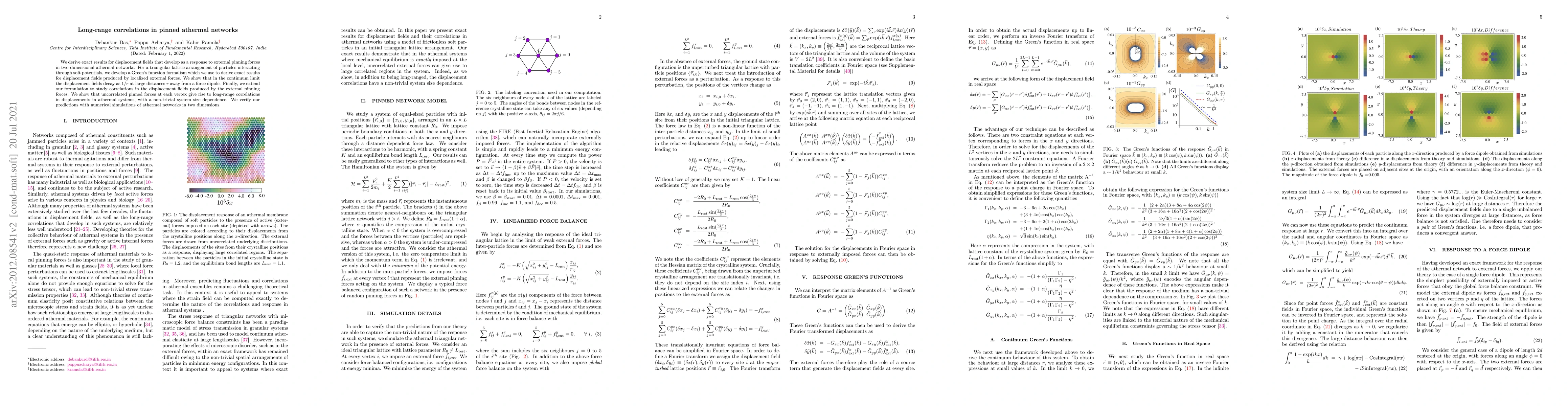 We derive exact results for displacement fields that develop as a response to external pinning forces in two dimensional athermal networks. For a triangular lattice arrangement of particles interacting through soft potentials, we develop a Green's function formalism which we use to derive exact results for displacement fields produced by localized external forces. We show that in the continuum limit the displacement fields decay as $1/r$ at large distances $r$ away from a force dipole. Finally, we extend our formulation to study correlations in the displacement fields produced by the external pinning forces. We show that uncorrelated pinned forces at each vertex give rise to long-range correlations in displacements in athermal systems, with a non-trivial system size dependence. We verify our predictions with numerical simulations of athermal networks in two dimensions.