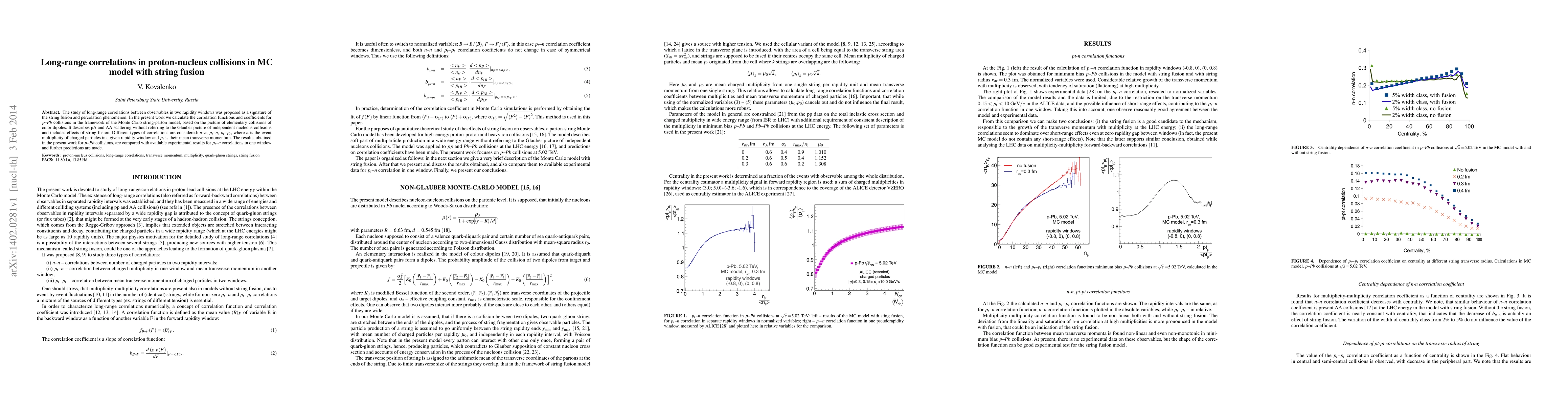 This paper investigates long-range correlations in proton-nucleus collisions using a Monte Carlo string-parton model that incorporates string fusion, comparing calculated correlation functions for n-n, pt-n, and pt-pt interactions to experimental data and making predictions for future observations.
