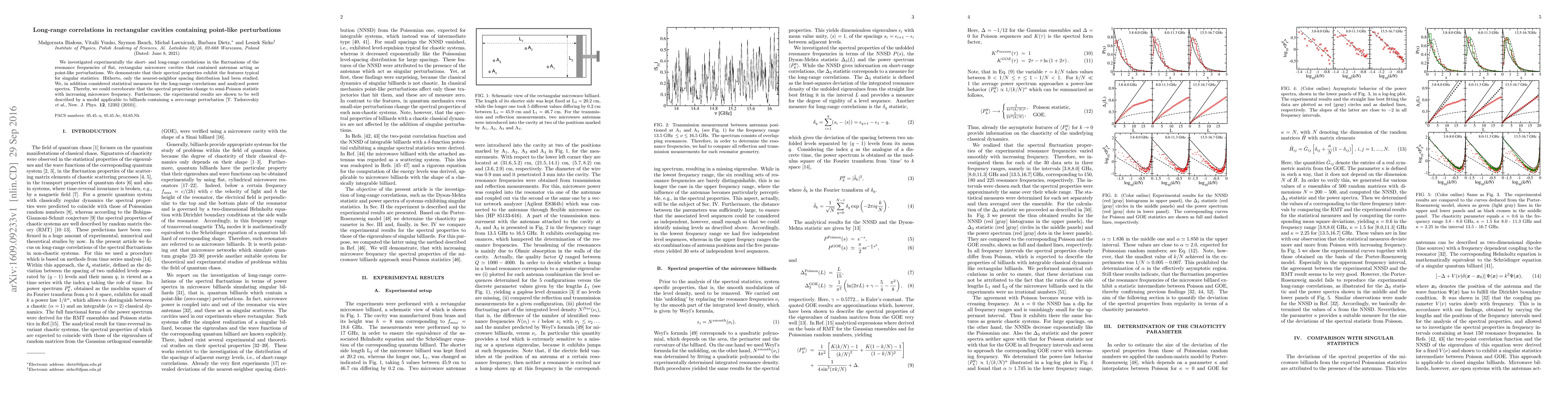 This paper experimentally investigates long-range correlations in the resonance frequencies of rectangular microwave cavities with antennas as point-like perturbations, revealing spectral properties akin to singular statistics. The study extends beyond nearest-neighbor spacing to include long-range correlations and power spectra, showing a transition to semi-Poisson statistics at higher frequencies, corroborated by a billiard model with zero-range perturbation.