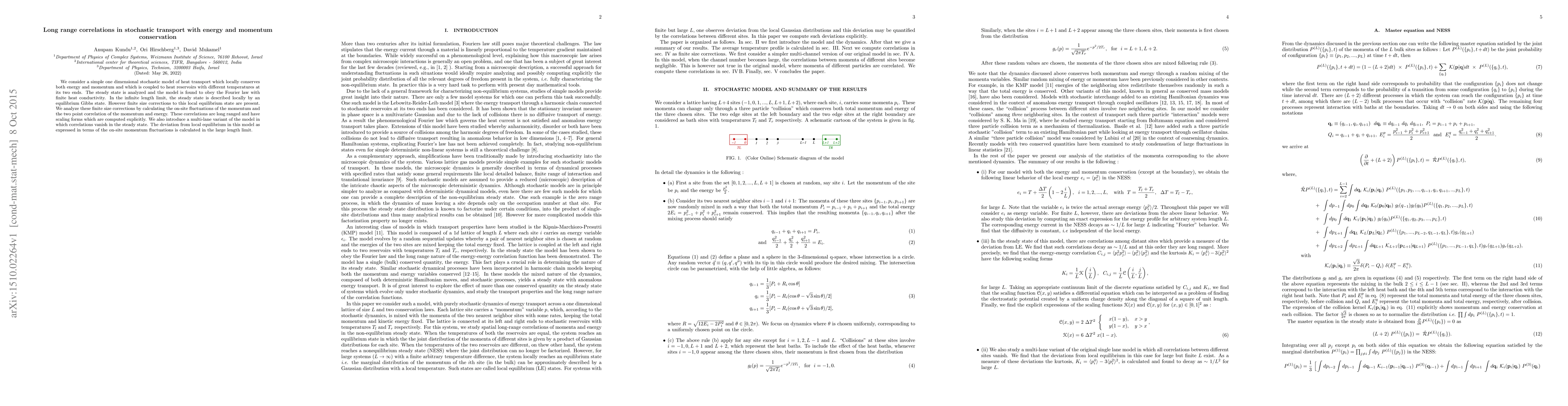 This paper investigates a one-dimensional stochastic heat transport model that conserves both energy and momentum, revealing long-range correlations in the steady state. The model exhibits Fourier law behavior with finite conductivity, and finite size corrections to local equilibrium are analyzed through momentum and energy correlations, which are shown to have explicit scaling forms.