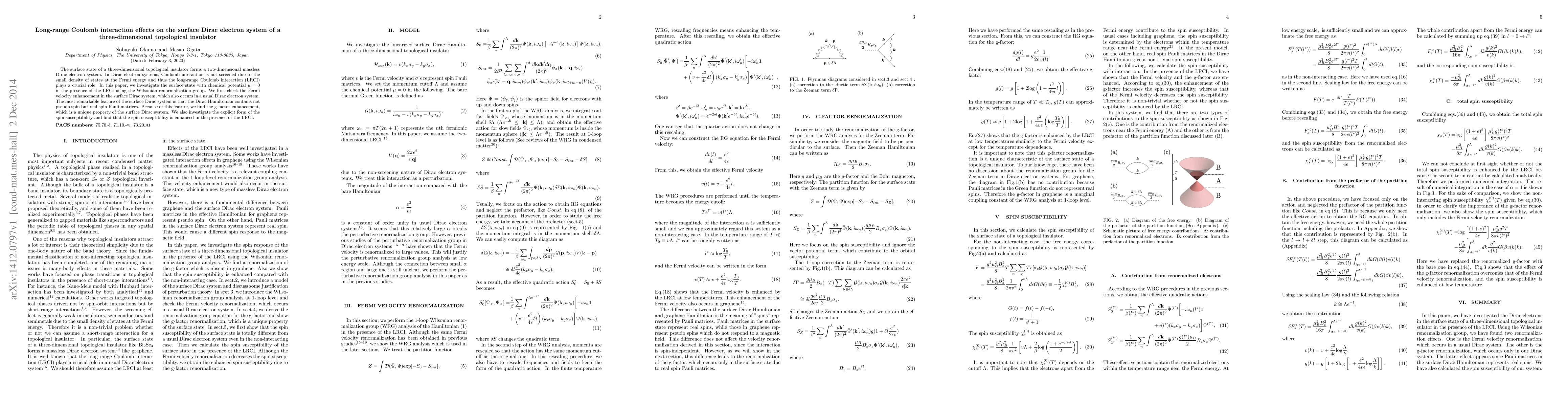 This paper investigates the long-range Coulomb interaction effects on the surface Dirac electron system of a three-dimensional topological insulator using the Wilsonian renormalization group. It finds enhanced Fermi velocity and a unique g-factor enhancement due to the real spin Pauli matrices in the Dirac Hamiltonian, along with an increased spin susceptibility.