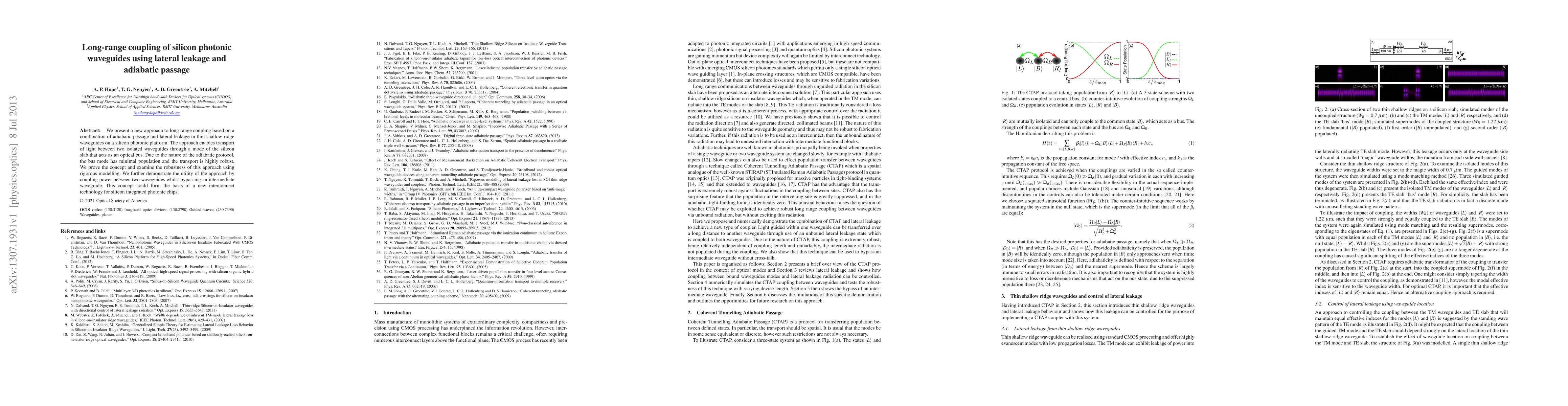 This paper introduces a novel method for long-range coupling in silicon photonics using adiabatic passage and lateral leakage in shallow ridge waveguides, enabling light transport via a silicon slab optical bus. The approach demonstrates high robustness and minimal bus mode population, potentially paving the way for advanced interconnect technologies in silicon photonic chips.