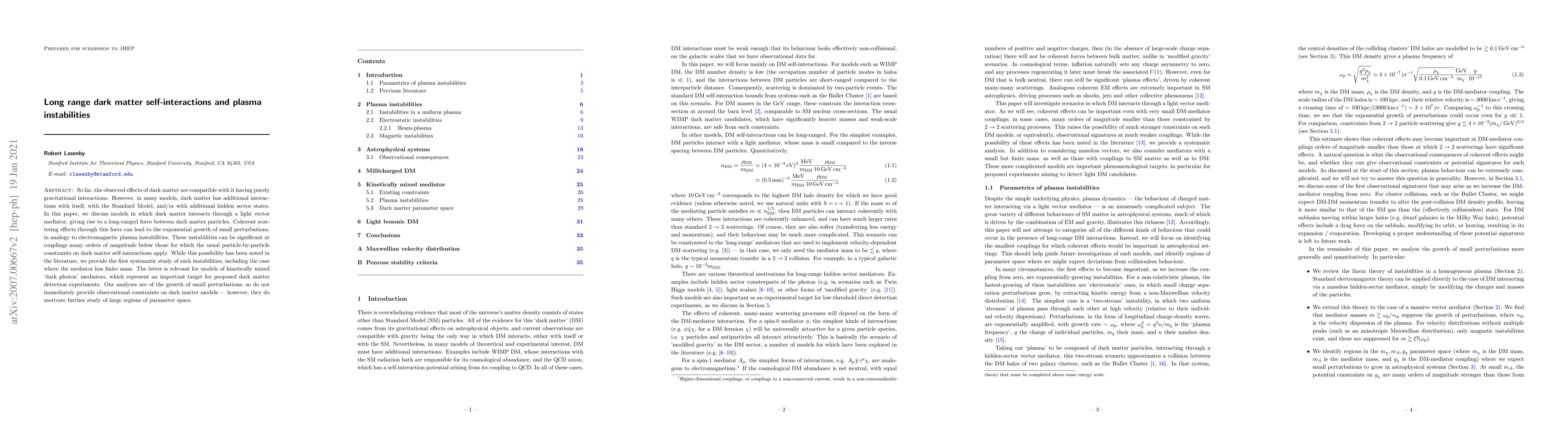 This paper explores models where dark matter exhibits long-range self-interactions mediated by a light vector particle, potentially leading to plasma-like instabilities. The study systematically investigates these instabilities, including scenarios with a finite-mass mediator, relevant for dark matter detection experiments.