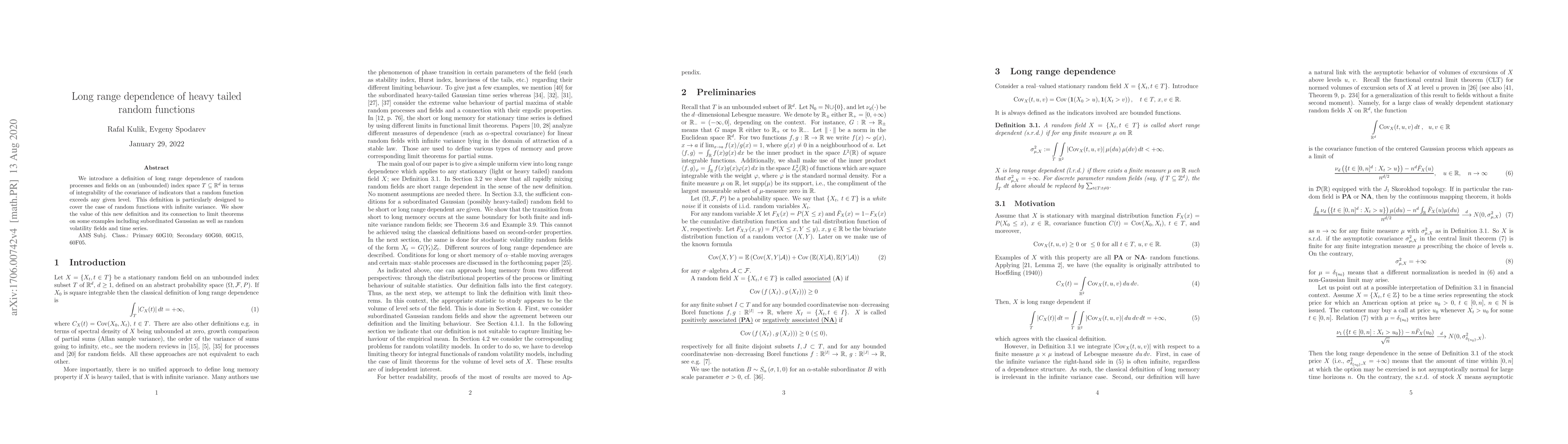 We introduce a definition of long range dependence of random processes and fields on an (unbounded) index space $T\subseteq \R^d$ in terms of integrability of the covariance of indicators that a random function exceeds any given level. This definition is particularly designed to cover the case of random functions with infinite variance. We show the value of this new definition and its connection to limit theorems on some examples including subordinated Gaussian as well as random volatility fields and time series.