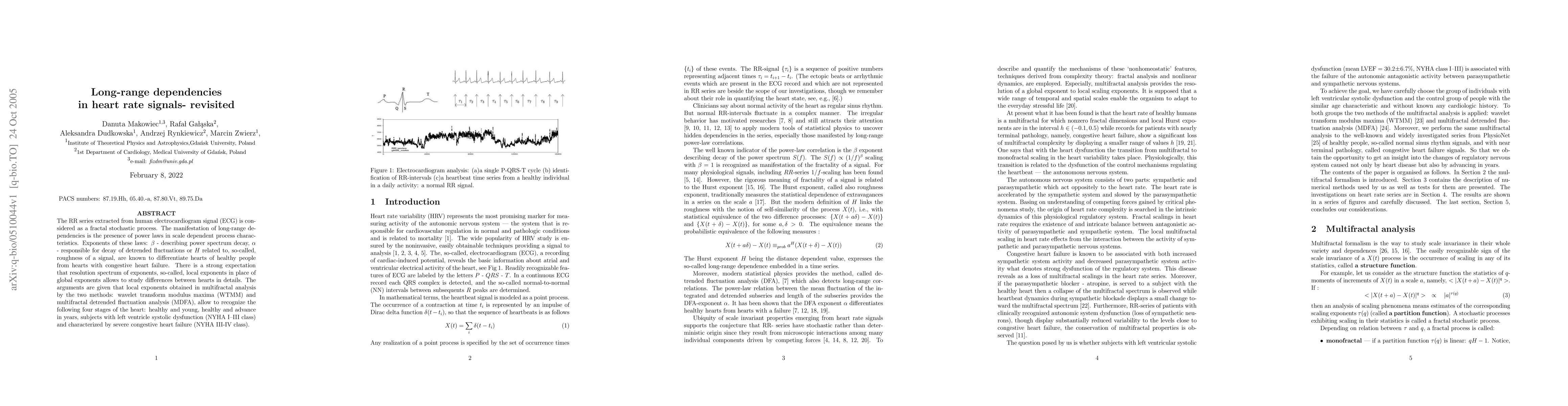 This paper investigates long-range dependencies in heart rate signals using multifractal analysis, demonstrating that local exponents derived from wavelet transform modulus maxima (WTMM) and multifractal detrended fluctuation analysis (MDFA) can distinguish between different stages of heart health, from healthy young to severe congestive heart failure.