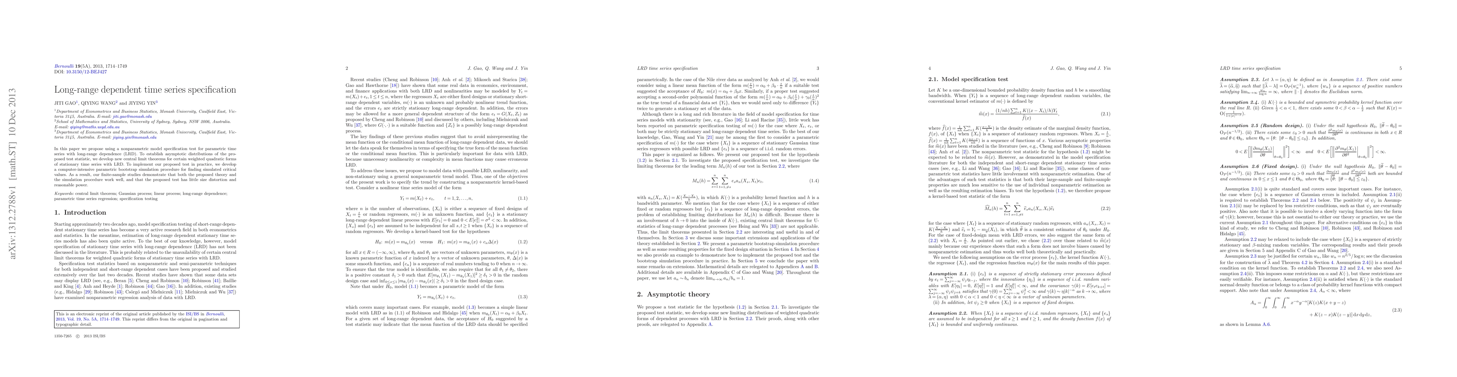 This paper proposes a nonparametric model specification test for parametric time series exhibiting long-range dependence, supported by new central limit theorems and a parametric bootstrap simulation procedure for critical values. The test shows minimal size distortion and reasonable power in finite-sample studies.