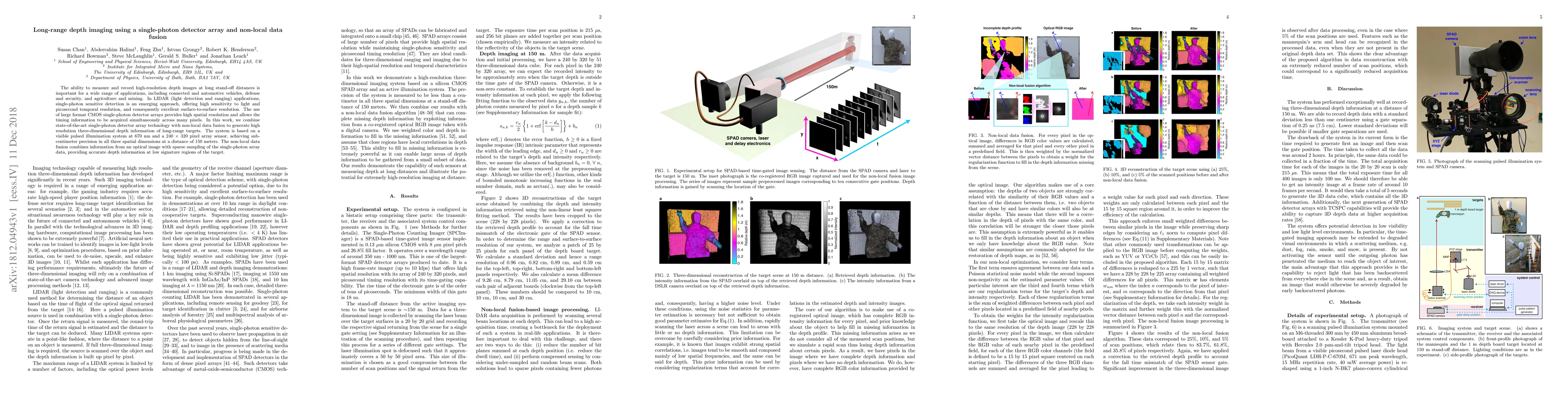 This paper presents a LIDAR system using a large format single-photon detector array and non-local data fusion to achieve high-resolution three-dimensional depth imaging at long distances, demonstrating sub-centimeter precision at 150 meters. The method combines visible pulsed illumination and sparse sampling to enhance depth accuracy in low signature regions.
