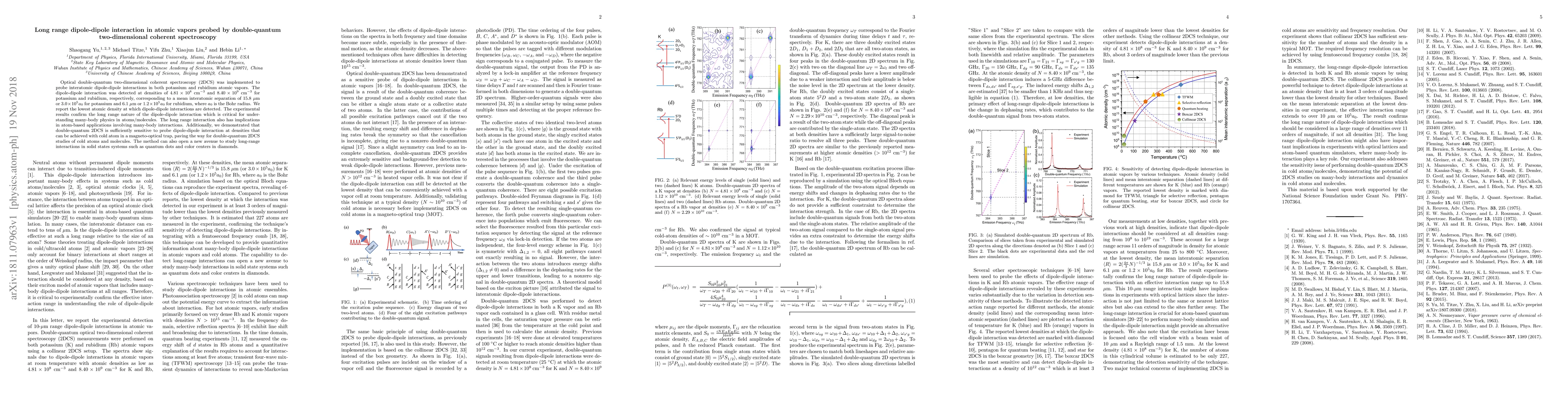 This paper employs double-quantum two-dimensional coherent spectroscopy to detect long-range dipole-dipole interactions in potassium and rubidium atomic vapors at unprecedented low densities, confirming their long-range nature and potential applications in many-body physics and cold atom studies.