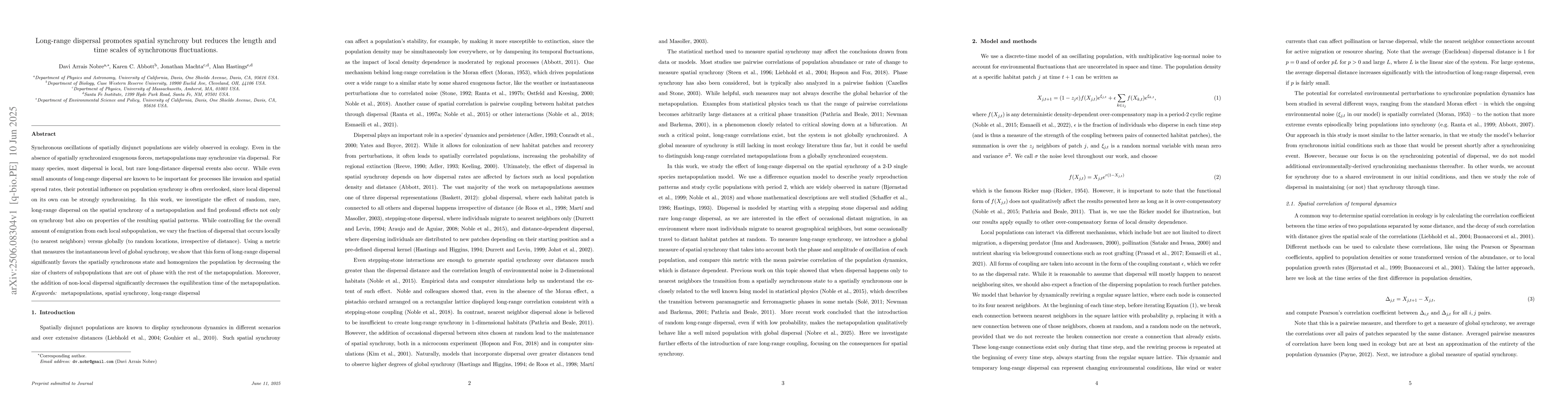 Long-range dispersal in populations enhances synchrony but speeds up equilibration times, altering spatial patterns and reducing cluster sizes of out-of-phase subpopulations.
