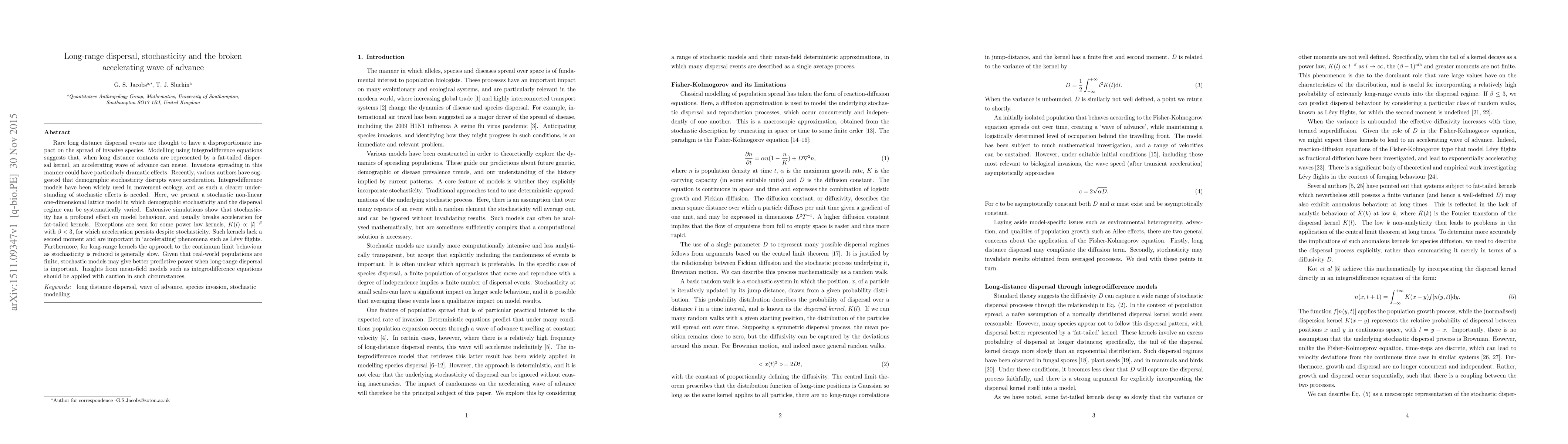 Rare long distance dispersal events are thought to have a disproportionate impact on the spread of invasive species. Modelling using integrodifference equations suggests that, when long distance contacts are represented by a fat-tailed dispersal kernel, an accelerating wave of advance can ensue. Invasions spreading in this manner could have particularly dramatic effects. Recently, various authors have suggested that demographic stochasticity disrupts wave acceleration. Integrodifference models have been widely used in movement ecology, and as such a clearer understanding of stochastic effects is needed. Here, we present a stochastic non-linear one-dimensional lattice model in which demographic stochasticity and the dispersal regime can be systematically varied. Extensive simulations show that stochasticity has a profound effect on model behaviour, and usually breaks acceleration for fat-tailed kernels. Exceptions are seen for some power law kernels, $K(l) \propto |l|^{-\beta}$ with $\beta < 3$, for which acceleration persists despite stochasticity. Such kernels lack a second moment and are important in `accelerating' phenomena such as L\'{e}vy flights. Furthermore, for long-range kernels the approach to the continuum limit behaviour as stochasticity is reduced is generally slow. Given that real-world populations are finite, stochastic models may give better predictive power when long-range dispersal is important. Insights from mean-field models such as integrodifference equations should be applied with caution in such circumstances.