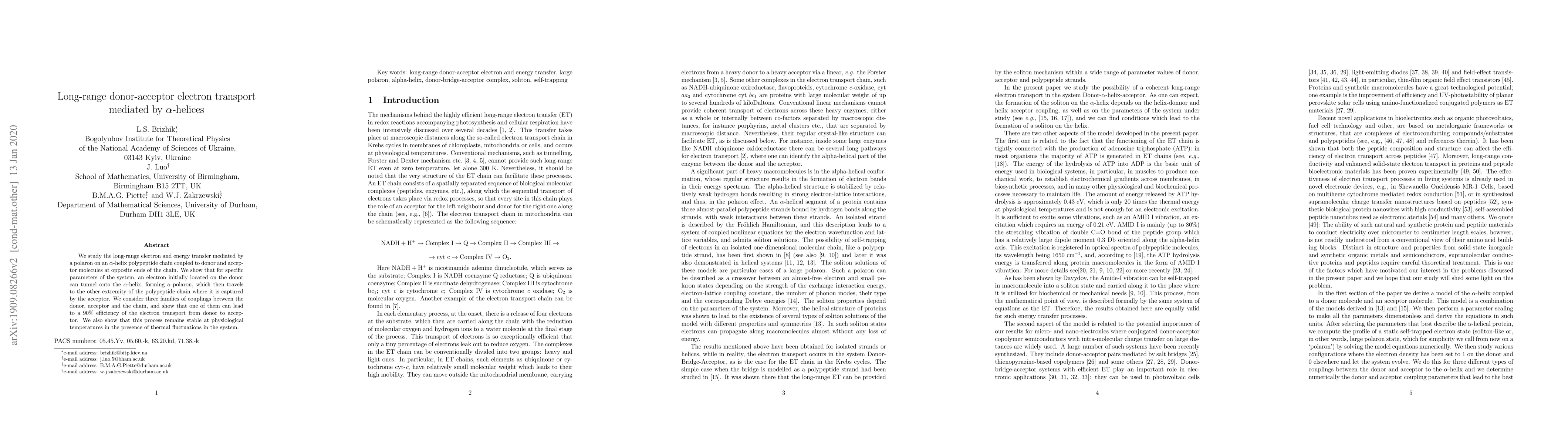 This research investigates electron transport via polarons on an $\alpha$-helix polypeptide, demonstrating that under specific conditions, a polaron can travel from a donor to an acceptor with 90% efficiency, remaining stable at physiological temperatures despite thermal fluctuations.
