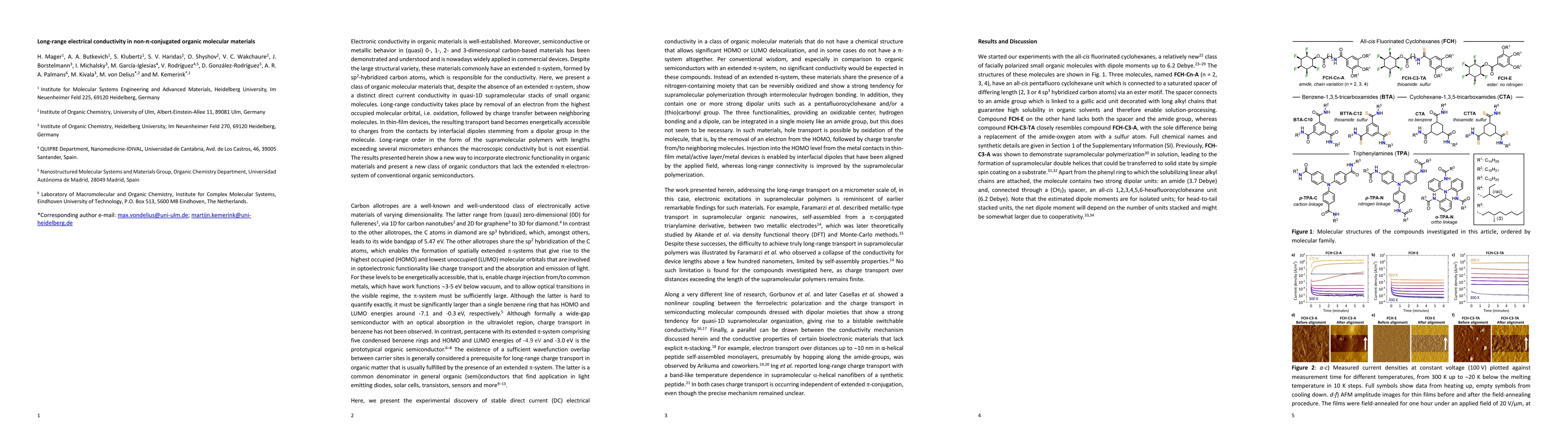 The research methodology involves the study of quasi-1D supramolecular stacks of small organic molecules lacking an extended π-system, demonstrating long-range direct current conductivity through oxidation and charge transfer between neighboring molecules, with interfacial dipoles from a dipolar group in the molecule making the transport band accessible to charges from the contacts.