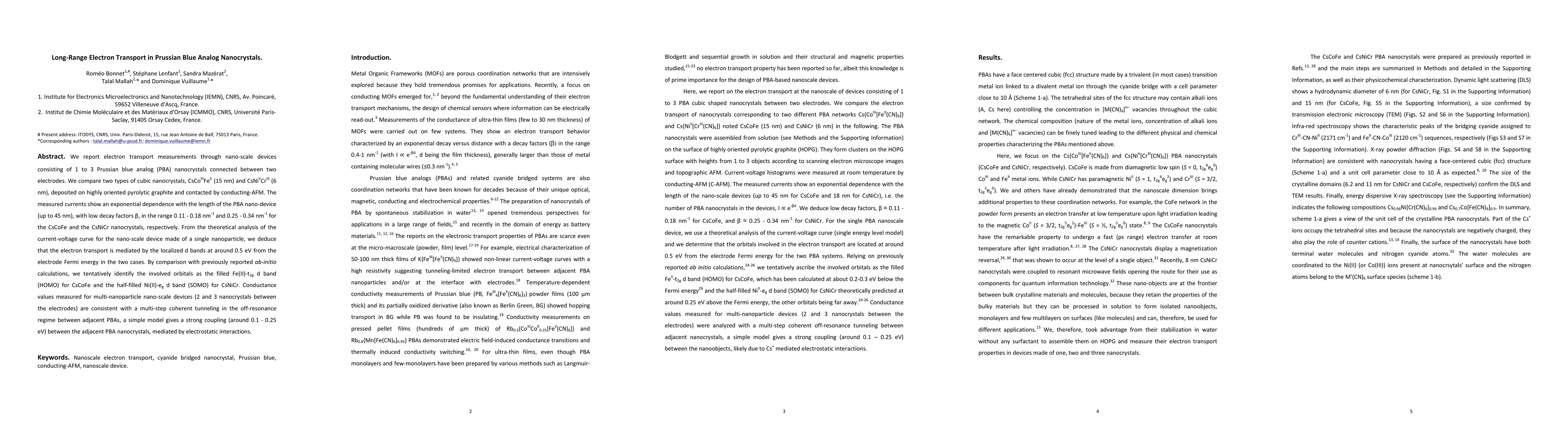 We report electron transport measurements through nano-scale devices consisting of 1 to 3 Prussian blue analog (PBA) nanocrystals connected between two electrodes. We compare two types of cubic nanocrystals, CsCoFe (15 nm) and CsNiCr (6 nm), deposited on highly oriented pyrolytic graphite and contacted by conducting-AFM. The measured currents show an exponential dependence with the length of the PBA nano-device (up to 45 nm), with low decay factors \b{eta}, in the range 0.11 - 0.18 nm-1 and 0.25 - 0.34 nm-1 for the CsCoFe and the CsNiCr nanocrystals, respectively. From the theoretical analysis of the current-voltage curve for the nano-scale device made of a single nanoparticle, we deduce that the electron transport is mediated by the localized d bands at around 0.5 eV from the electrode Fermi energy in the two cases. By comparison with previously reported ab-initio calculations, we tentatively identify the involved orbitals as the filled Fe(II)-t2g d band (HOMO) for CsCoFe and the half-filled Ni(II)-eg d band (SOMO) for CsNiCr. Conductance values measured for multi-nanoparticle nano-scale devices (2 and 3 nanocrystals between the electrodes) are consistent with a multi-step coherent tunneling in the off-resonance regime between adjacent PBAs, a simple model gives a strong coupling (around 0.1 - 0.25 eV) between the adjacent PBA nanocrystals, mediated by electrostatic interactions.