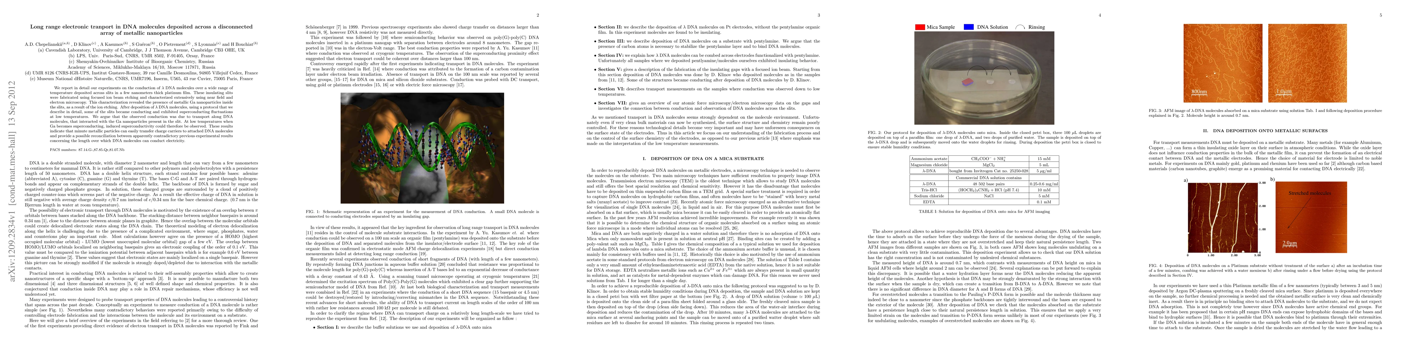 We report in detail our experiments on the conduction of $\lambda$ DNA molecules over a wide range of temperature deposited across slits in a few nanometers thick platinum film. These insulating slits were fabricated using focused ion beam etching and characterized extensively using near field and electron microscopy. This characterization revealed the presence of metallic Ga nanoparticles inside the slits, as a result of the ion etching. After deposition of $\lambda$ DNA molecules, using a protocol that we describe in detail, some of the slits became conducting and exhibited superconducting fluctuations at low temperatures. We argue that the observed conduction was due to transport along DNA molecules, that interacted with the Ga nanoparticles present in the slit. At low temperatures when Ga becomes superconducting, induced superconductivity could therefore be observed. These results indicate that minute metallic particles can easily transfer charge carriers to attached DNA molecules and provide a possible reconciliation between apparently contradictory previous experimental results concerning the length over which DNA molecules can conduct electricity.