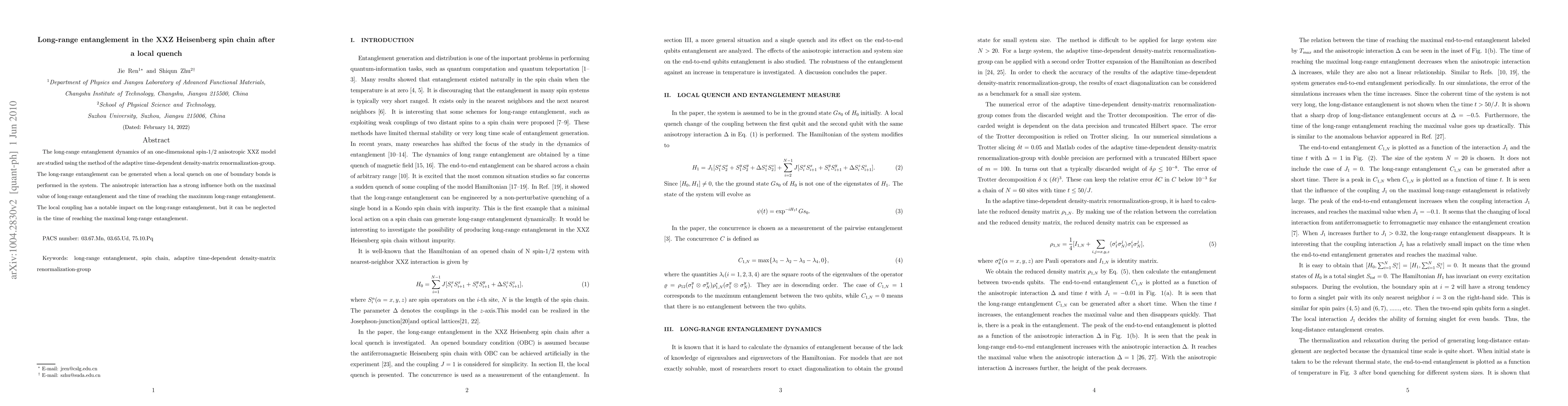 Summary: The study employs adaptive time-dependent density-matrix renormalization-group to investigate long-range entanglement in an XXZ spin chain post a local quench, revealing significant effects of anisotropic interactions on entanglement dynamics and minimal impact of local coupling on the timing of maximal entanglement.