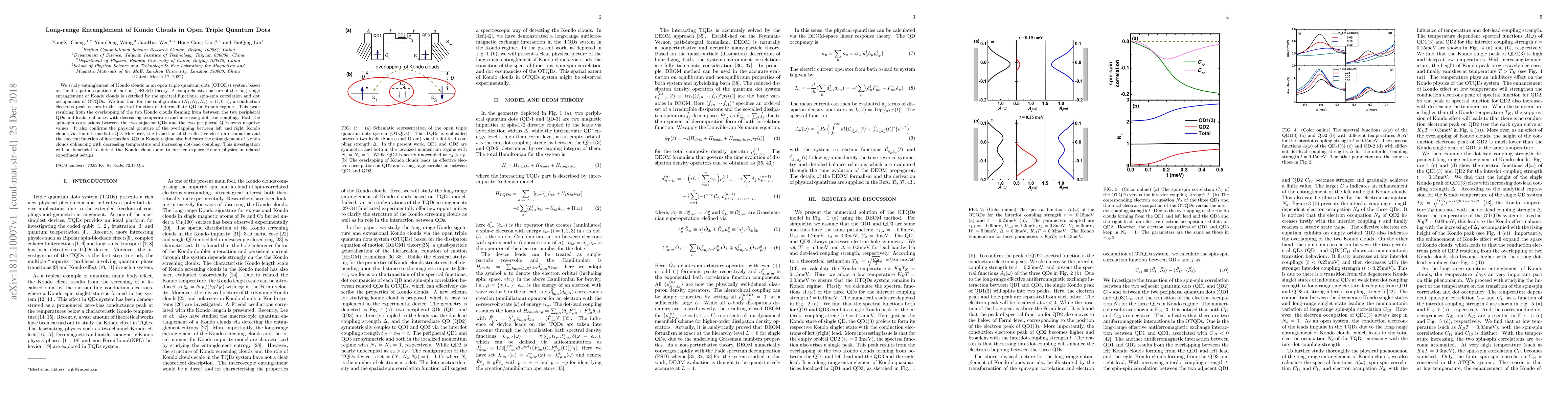 This paper investigates the long-range entanglement of Kondo clouds in open triple quantum dots using DEOM theory, revealing a peak in the spectral function of the intermediate dot due to overlapping Kondo clouds. The study finds that entanglement increases with decreasing temperature and stronger dot-lead coupling, evidenced by negative spin-spin correlations and changes in electron occupation and spectral functions.