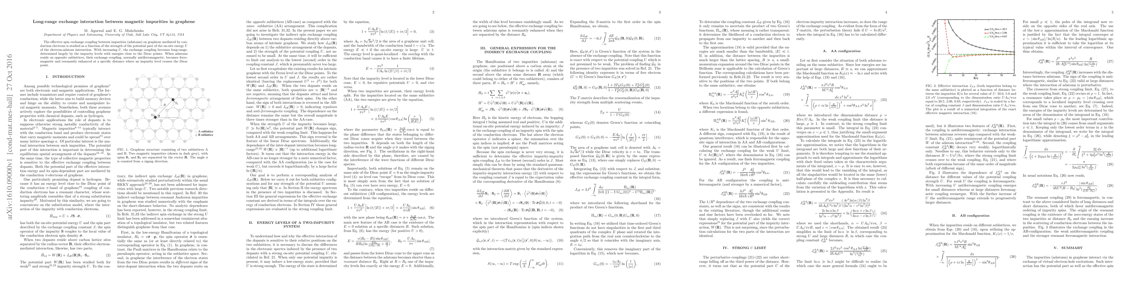 Summary: This study investigates the spin exchange interaction between magnetic impurities on graphene, showing that as the electron-adatom interaction strength increases, the exchange coupling becomes long-ranged, especially near Dirac points. At specific distances, the antiferromagnetic coupling between impurities on opposite sublattices turns ferromagnetic and is resonantly enhanced.
