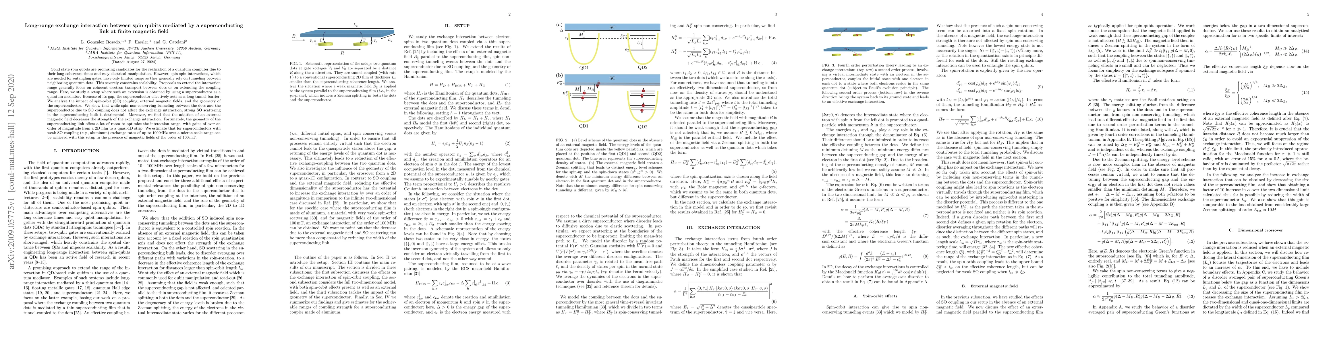 This paper investigates extending the range of spin-spin interactions in solid-state spin qubits using a superconducting link, finding that while spin-orbit coupling and magnetic fields can affect the interaction strength, optimizing the geometry of the superconductor can enhance the exchange interaction by over an order of magnitude, potentially achieving rates of up to 100 MHz over micron scales.