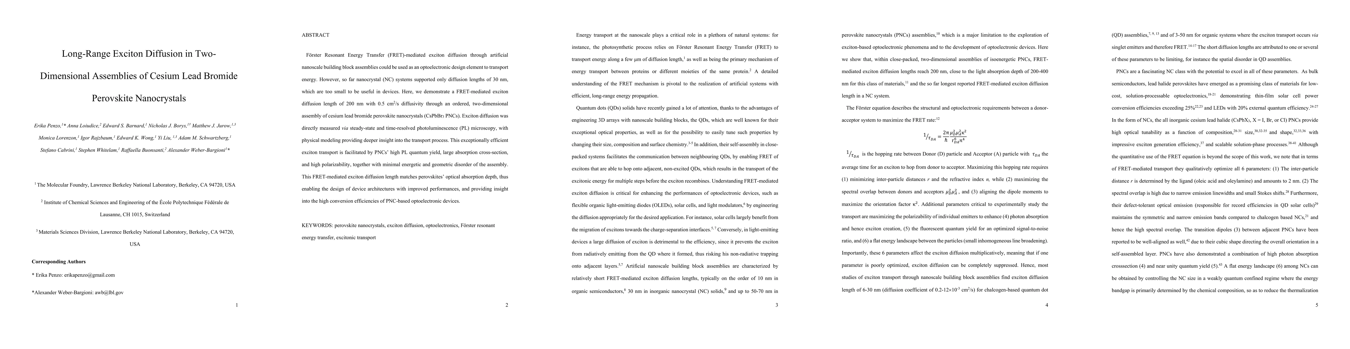 This paper demonstrates the achievement of a 200 nm FRET-mediated exciton diffusion length in two-dimensional assemblies of cesium lead bromide perovskite nanocrystals, significantly enhancing potential for optoelectronic applications. The high efficiency is attributed to the nanocrystals' properties and minimal disorder in the assembly.