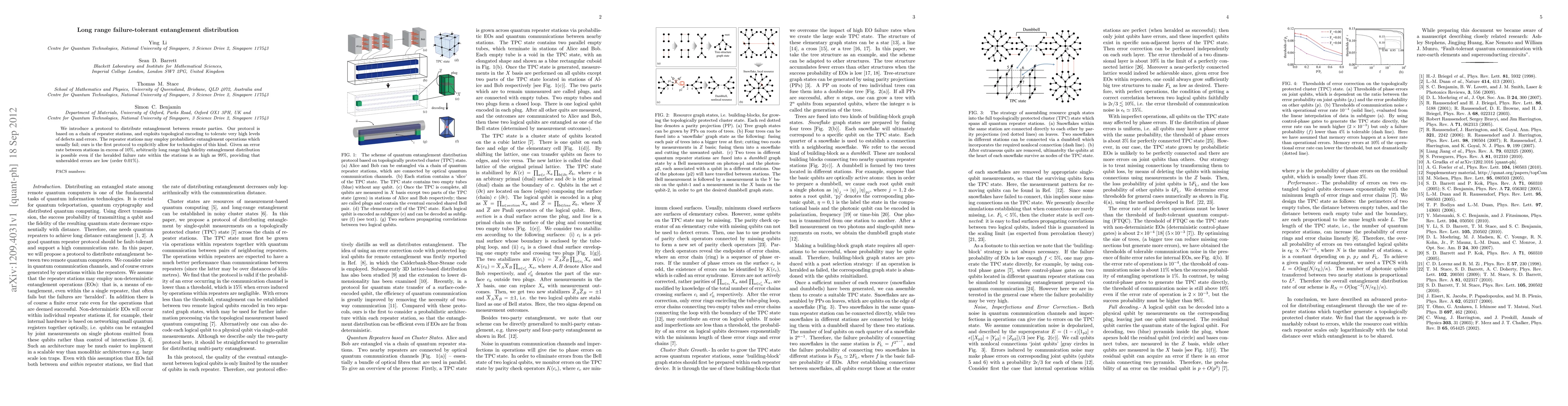 We introduce a protocol to distribute entanglement between remote parties. Our protocol is based on a chain of repeater stations, and exploits topological encoding to tolerate very high levels of defects and errors. The repeater stations may employ probabilistic entanglement operations which usually fail; ours is the first protocol to explicitly allow for technologies of this kind. Given an error rate between stations in excess of 10%, arbitrarily long range high fidelity entanglement distribution is possible even if the heralded failure rate within the stations is as high as 99%, providing that unheralded errors are low (order 0.01%).