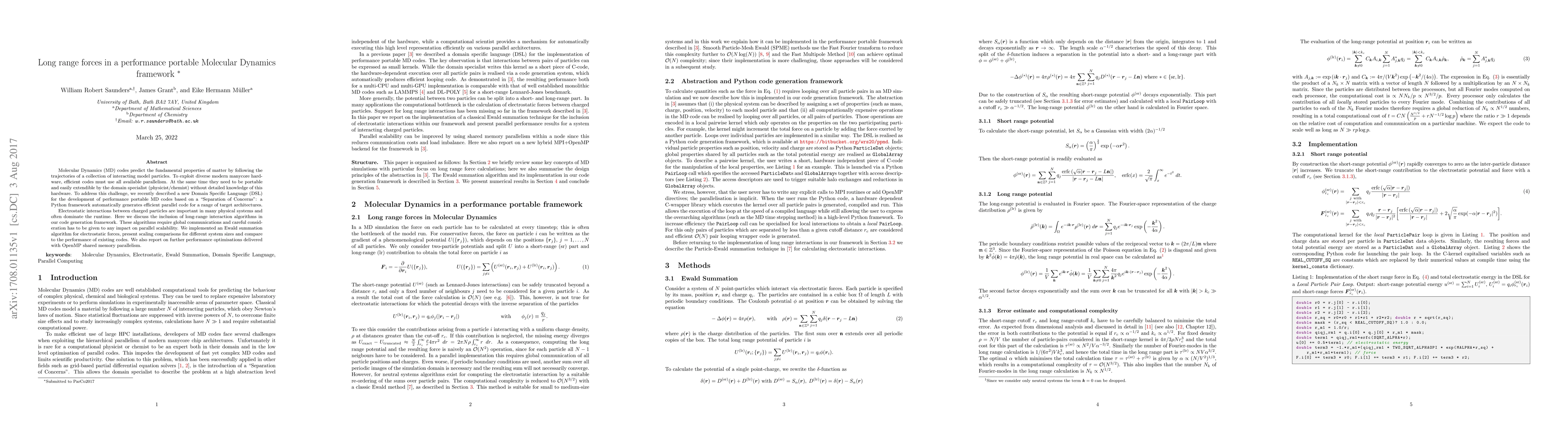 Molecular Dynamics (MD) codes predict the fundamental properties of matter by following the trajectories of a collection of interacting model particles. To exploit diverse modern manycore hardware, efficient codes must use all available parallelism. At the same time they need to be portable and easily extendible by the domain specialist (physicist/chemist) without detailed knowledge of this hardware. To address this challenge, we recently described a new Domain Specific Language (DSL) for the development of performance portable MD codes based on a "Separation of Concerns": a Python framework automatically generates efficient parallel code for a range of target architectures. Electrostatic interactions between charged particles are important in many physical systems and often dominate the runtime. Here we discuss the inclusion of long-range interaction algorithms in our code generation framework. These algorithms require global communications and careful consideration has to be given to any impact on parallel scalability. We implemented an Ewald summation algorithm for electrostatic forces, present scaling comparisons for different system sizes and compare to the performance of existing codes. We also report on further performance optimisations delivered with OpenMP shared memory parallelism.