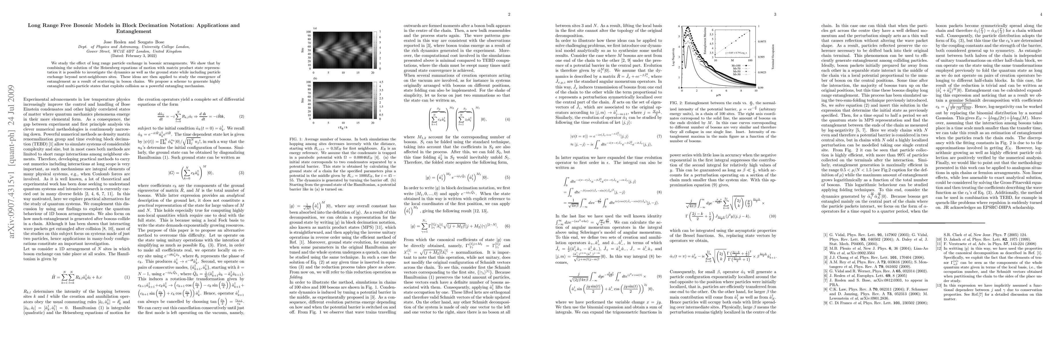 This paper explores the dynamics and entanglement in long-range free bosonic models using block decimation notation. It combines Heisenberg equations of motion with matrix product states to study particle exchange beyond nearest neighbors, leading to the generation of highly entangled multi-particle states through scattering.