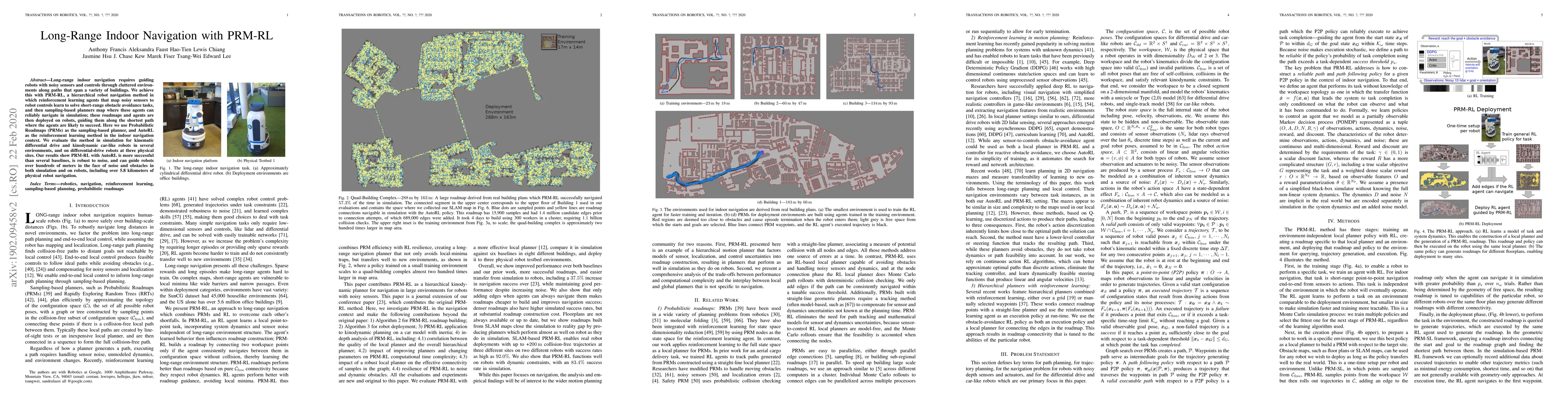 The paper presents PRM-RL, a hierarchical navigation method combining reinforcement learning and Probabilistic Roadmaps for long-range indoor navigation, demonstrating successful and robust robot navigation over hundreds of meters in both simulated and real environments. The method outperforms baselines and effectively handles noisy sensors and controls.
