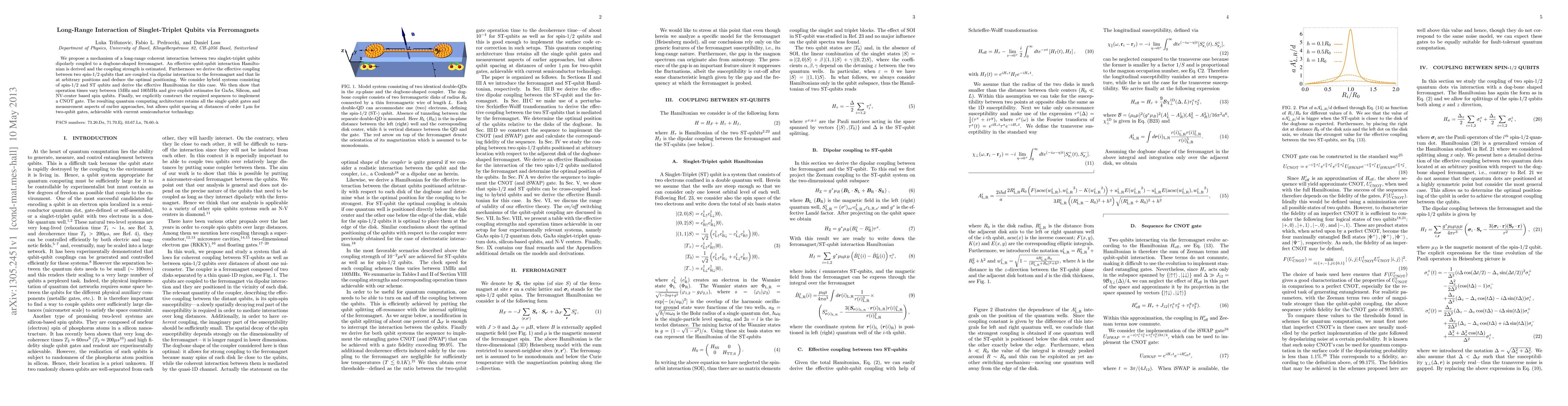 We propose a mechanism of a long-range coherent interaction between two singlet-triplet qubits dipolarly coupled to a dogbone-shaped ferromagnet. An effective qubit-qubit interaction Hamiltonian is derived and the coupling strength is estimated. Furthermore we derive the effective coupling between two spin-1/2 qubits that are coupled via dipolar interaction to the ferromagnet and that lie at arbitrary positions and deduce the optimal positioning. We consider hybrid systems consisting of spin-1/2 and ST qubits and derive the effective Hamiltonian for this case. We then show that operation times vary between 1MHz and 100MHz and give explicit estimates for GaAs, Silicon, and NV-center based spin qubits. Finally, we explicitly construct the required sequences to implement a CNOT gate. The resulting quantum computing architecture retains all the single qubit gates and measurement aspects of earlier approaches, but allows qubit spacing at distances of order 1$\,\mu$m for two-qubit gates, achievable with current semiconductor technology.
