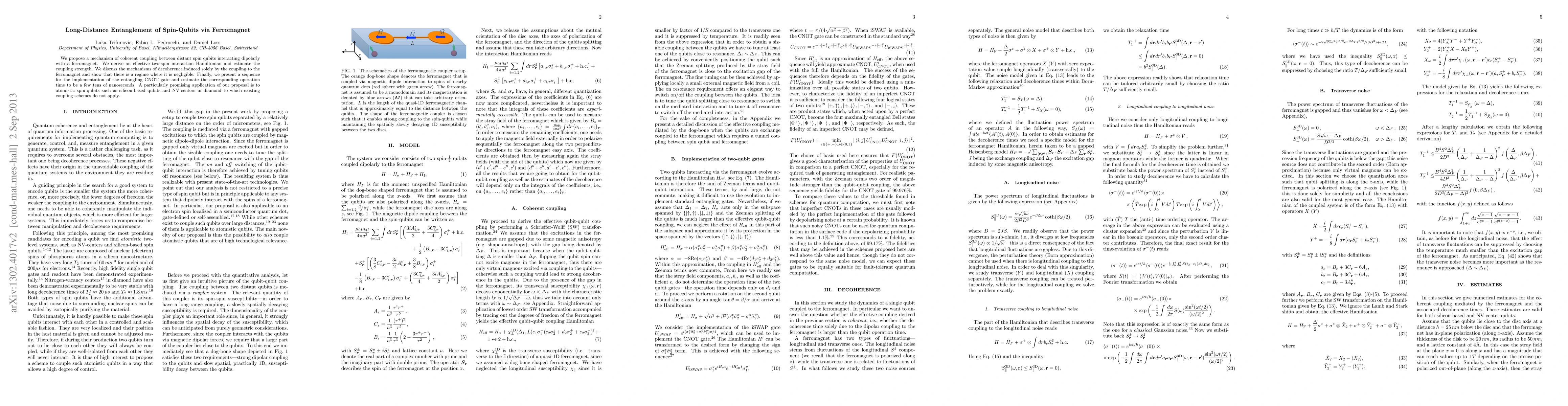 We propose a mechanism of coherent coupling between distant spin qubits interacting dipolarly with a ferromagnet. We derive an effective two-spin interaction Hamiltonian and estimate the coupling strength. We discuss the mechanisms of decoherence induced solely by the coupling to the ferromagnet and show that there is a regime where it is negligible. Finally, we present a sequence for the implementation of the entangling CNOT gate and estimate the corresponding operation time to be a few tens of nanoseconds. A particularly promising application of our proposal is to atomistic spin-qubits such as silicon-based qubits and NV-centers in diamond to which existing coupling schemes do not apply.