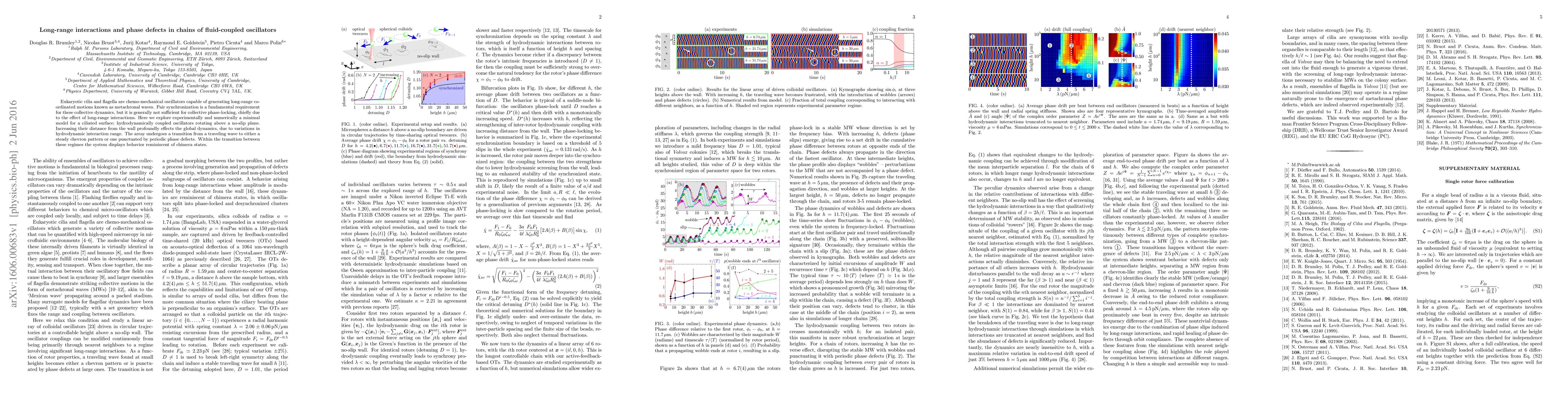 This paper investigates the dynamics of fluid-coupled oscillators, like eukaryotic cilia, exploring how long-range interactions and distance from a no-slip plane influence phase synchronization and collective motion, leading to transitions from traveling waves to chevron patterns and chimera states.