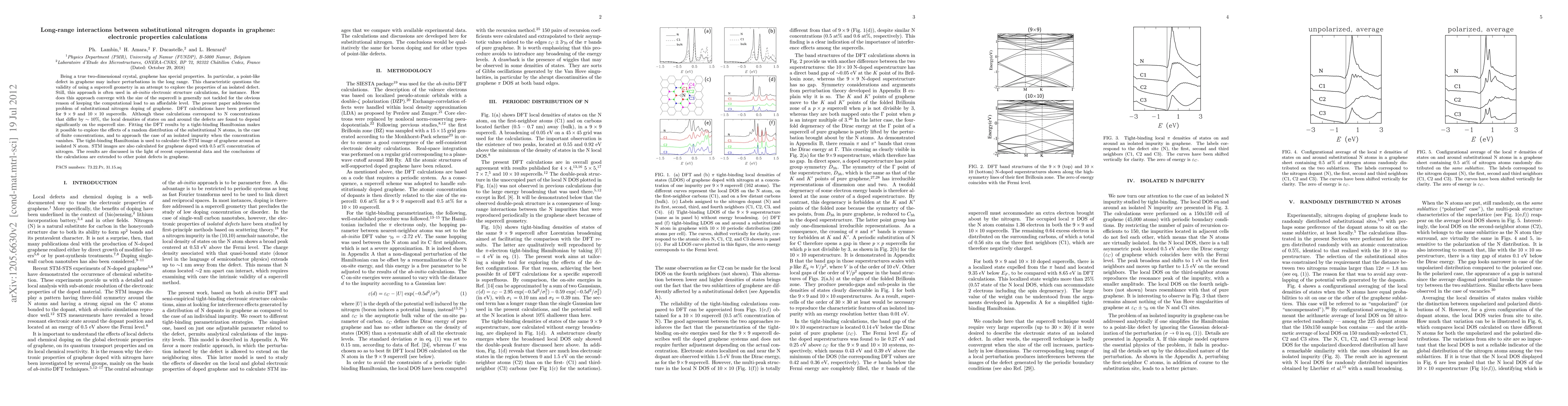 Researchers investigated long-range interactions between substitutional nitrogen dopants in graphene using DFT calculations, finding that local densities of states depend significantly on supercell size, and proposed a tight-binding Hamiltonian for exploring defect properties.